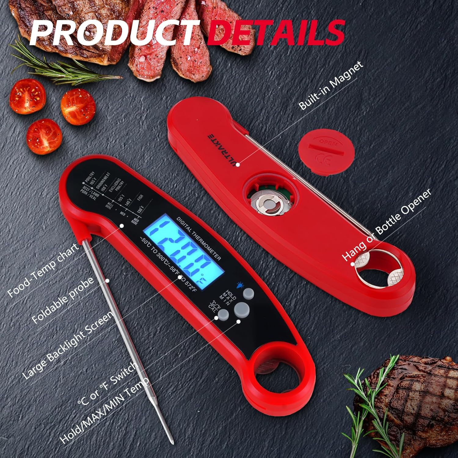 - 【Practical & Convenient Storage】 The meat thermometer has a magnetic back and a hang hole for hooks, which can be hung on the kitchen wall or attached to any iron surface like refrigerator, you can conveniently store this where you can have easy and quick access! Designed with a bottle opener, you can also use it to open the beer bottles.