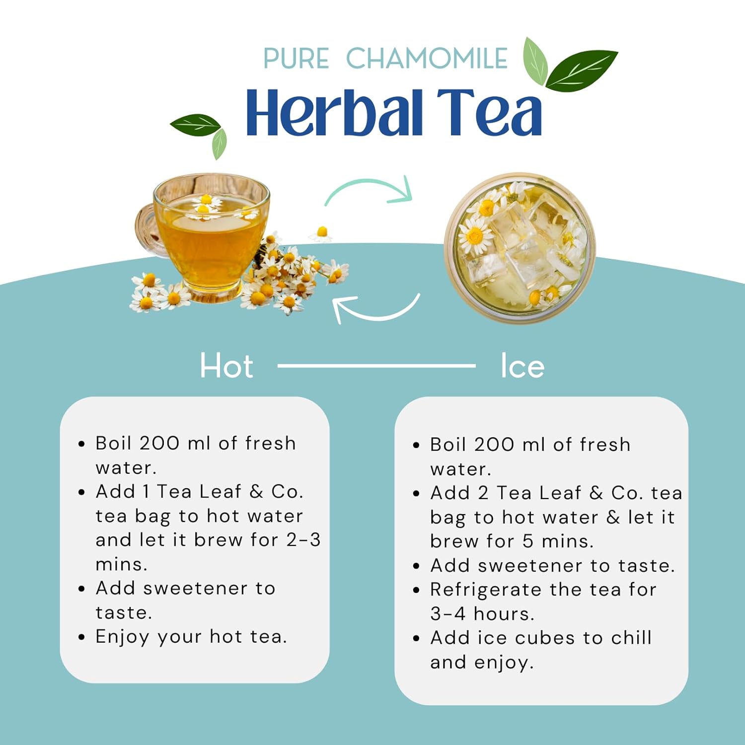 - CHAMOMILE HERBAL TEA: Experience the sweet and soothing taste of 100% Chamomile tea. Its soft, floral aroma enhances relaxation, making it a delightful choice for a calming and smooth tea experience.