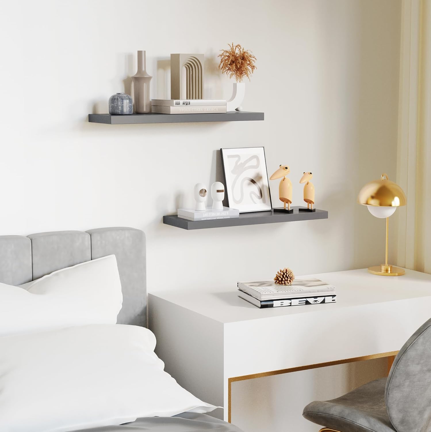 - 【Versatile & Functional】Our gray floating shelves for wall can simplify our life which let everything will be in reach. Our wall shelf is a perfect space to display our family pictures, books, memorandums, charming antiques or artwork, spices or jars and fresh green plant. Our floating shelf wood not only give us extra storage but also improve the beauty of our home decor. Our gray shelves can be perfectly integrated and decorated in the bathroom, kitchen, living room, bedroom and other place.