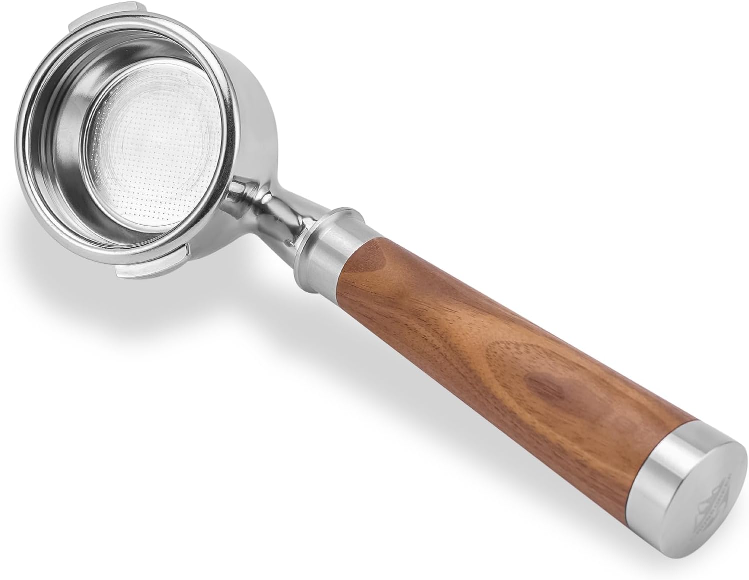 - UNIQUE WALNUT HANDLE. The handle of our bottomless portafilter is carefully crafted to ensure optimal comfort and stability during use. Made of natural walnut, the handle is designed to fit comfortably in your hand, providing a natural grip that minimizes fatigue and strain. The ergonomic design also ensures that the portafilter remains stable during the extracting process, allowing you to maintain precise control and achieve the perfect extraction every time