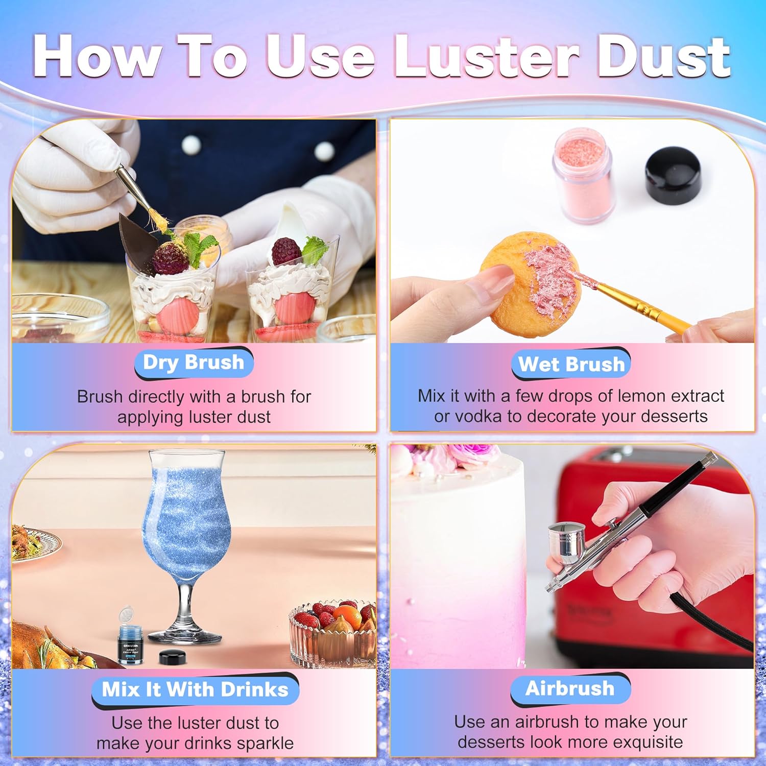 - [ Does NOT Affect The Original Flavor ]: Edible luster dust just makes drinks and food more beautiful without change the original taste, please feel free to use powder edible glitter in food and drink.