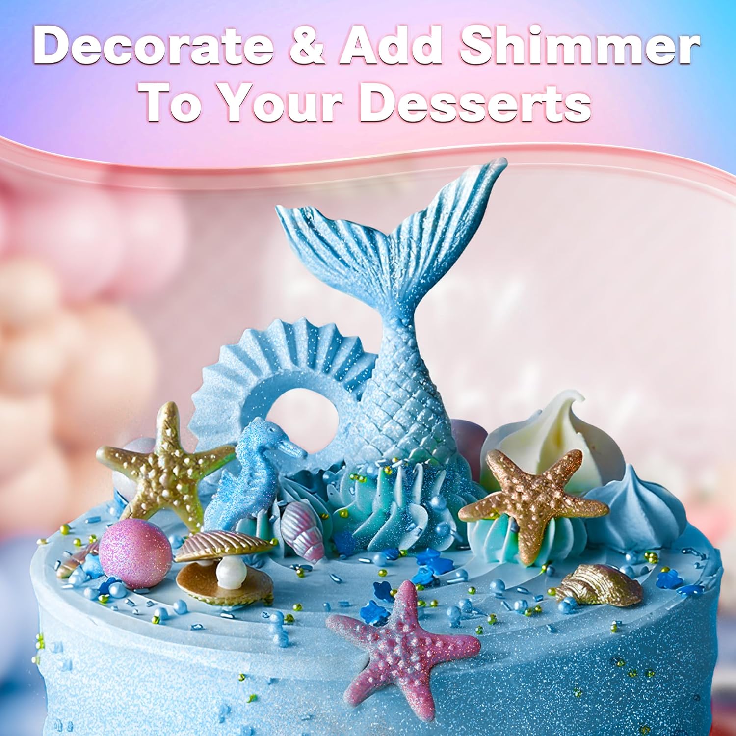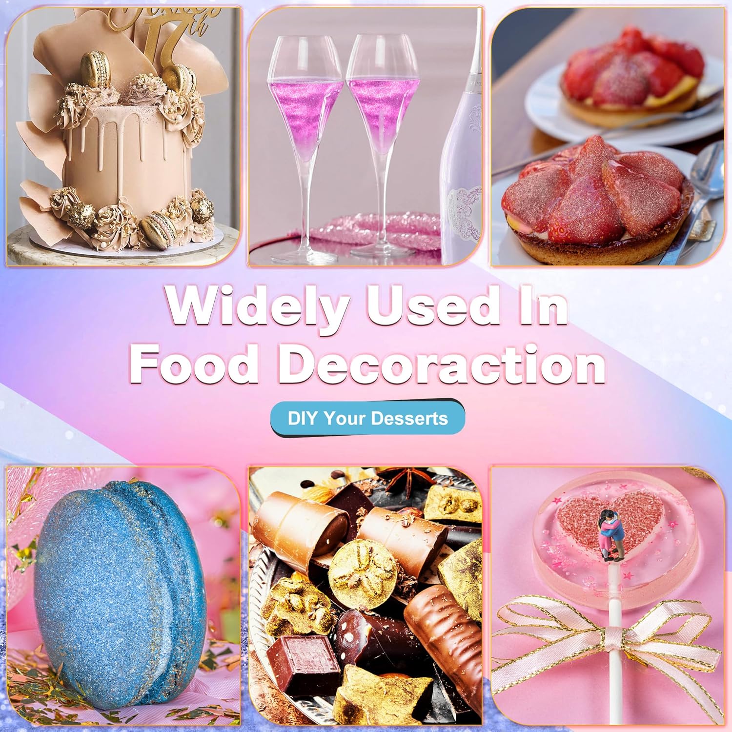 - [ Food Grade Edible Luster Dust ]: Edible glitter is made of mica, titanium dioxide and iron trioxide, which are colors additives specifically approved for food. Our edible glimmer powder is qualified with all certifications, 100% safe for cocktails, cupcakes, cookies, strawberries, champagne, ice cream, wine, drinks and foods.