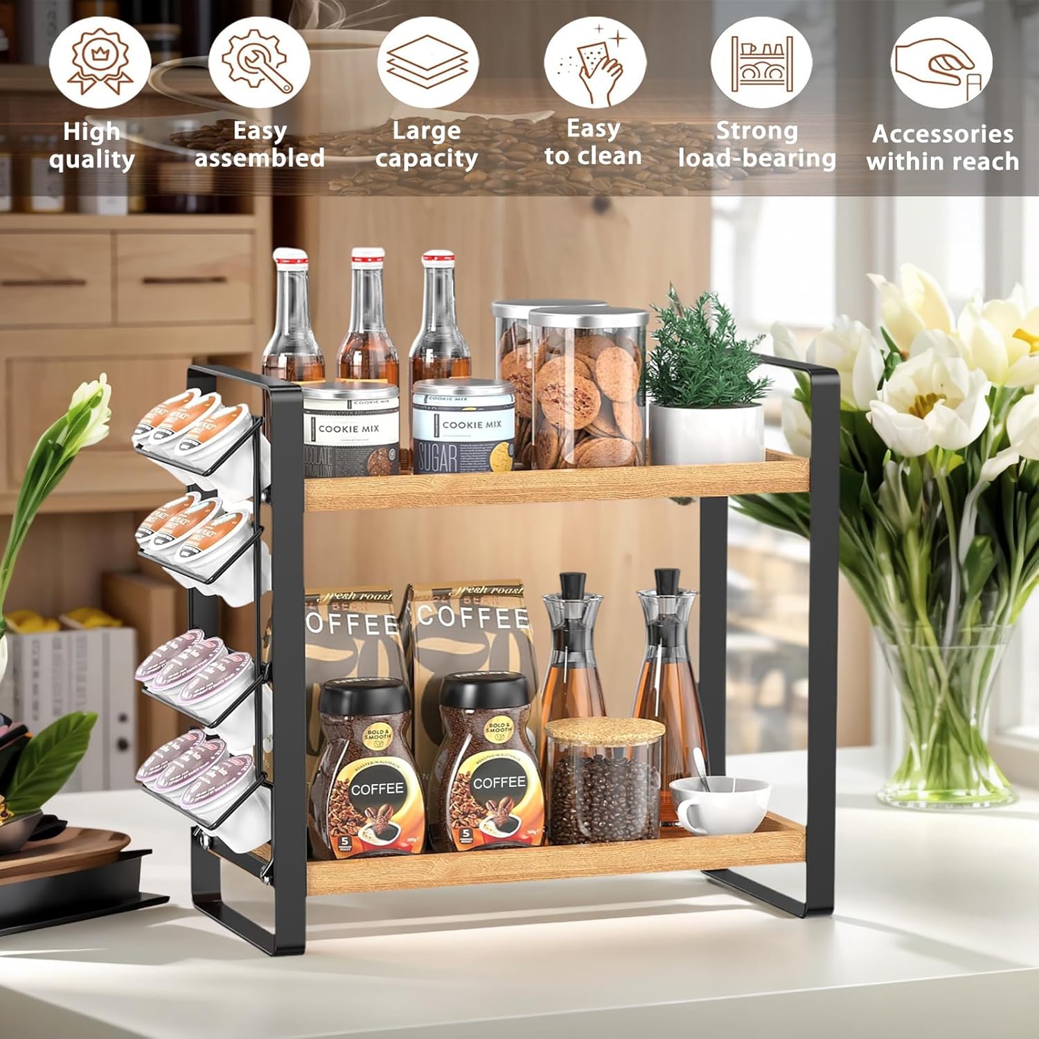 - JUST RIGHT COFFEE STATION ORGANIZER: The simple Wood shelf design carefully creat coffee bar accessories organizer and storage.This coffee bar organizer has 3 spacious compartments, the 2 Tier wood shelves used to store coffee pods, sugar, tea bags, instant coffee and more,and the side Metal Coffee Rack is compatible with 12 K Cup pods.The entire shelf greatly expands the usage space and makes it easier for you to pick up coffee bar acessoires