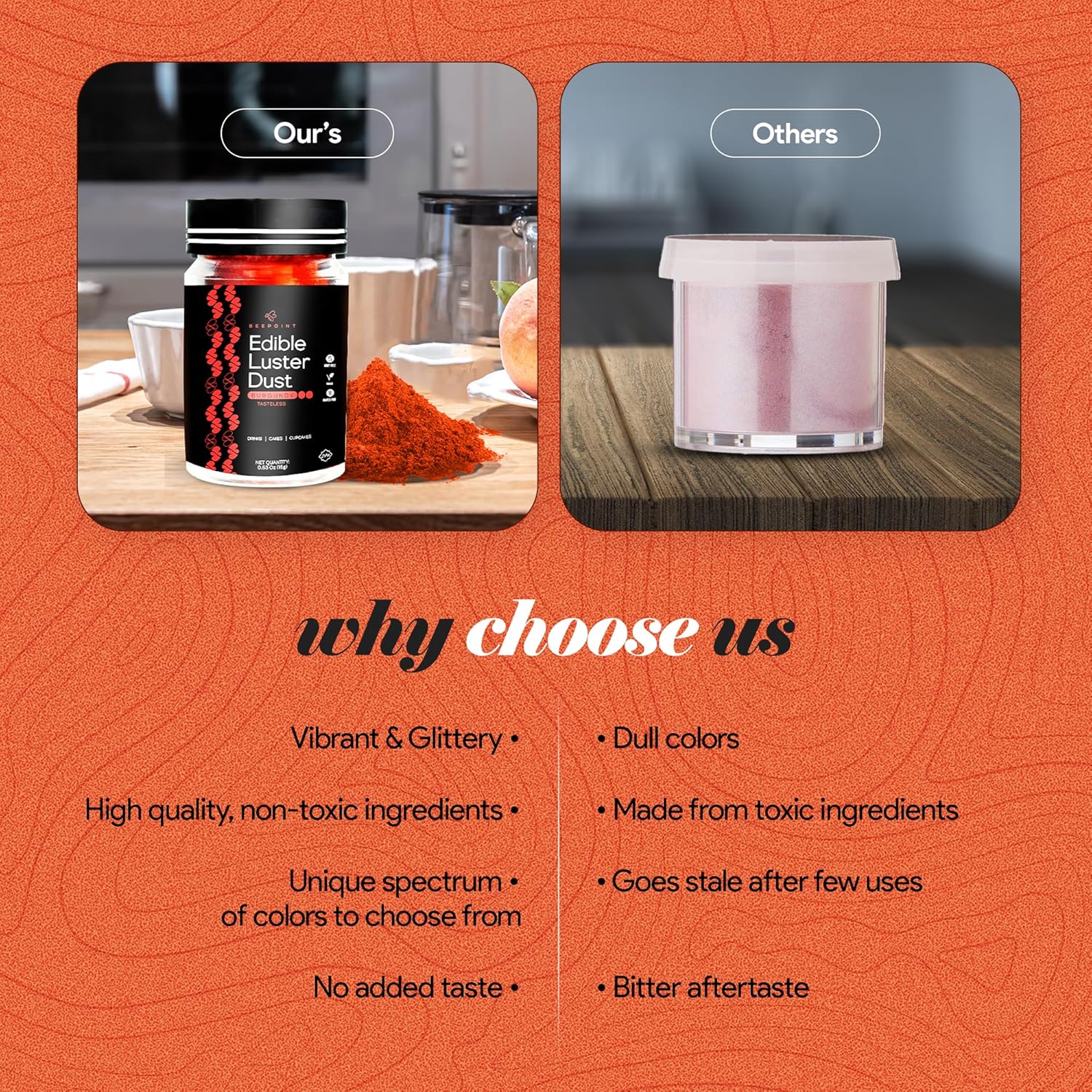 - Elevate Your Look with Precision: Experience the allure of our enhanced formula edible luster dust powder. With its refined texture, a mere dab achieves your desired effect. Each bottle contains 15g of transformative brilliance