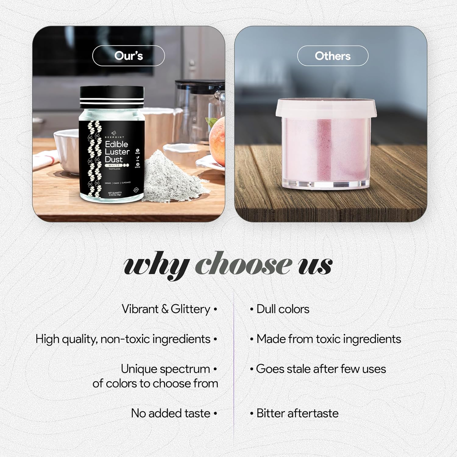- Elevate Your Look with Precision: Experience the allure of our enhanced formula edible luster dust powder. With its refined texture, a mere dab achieves your desired effect. Each bottle contains 15g of transformative brilliance