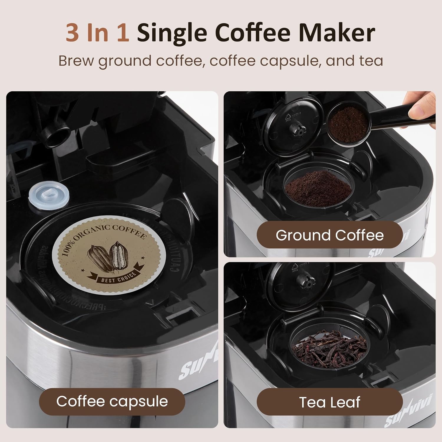 - 🍵【3-in-1 Brew, Limitless Flavor】 Experience the versatility of this coffee maker, boasting a reusable filter basket and K cup capsule holder. From traditional coffee powder to convenient capsules, and even tea, it adapts seamlessly to your diverse taste preferences. Enjoy a wide variety of drinks for an unmatched experience.