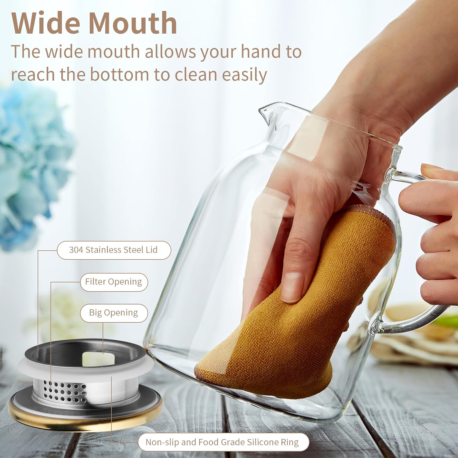 - Anti-Drip Spout & Comfortable Handle: The pour spout is drip-free and the larger and wider handle is easy and comfortable for small and large hands to hold. Wide Mouth Opening for Easily Clean: Both the lid and the pitcher itself are extremely easy to clean, you can even clean it in the dishwasher. The wide mouth will allow your hand to reach in and clean down to the bottom