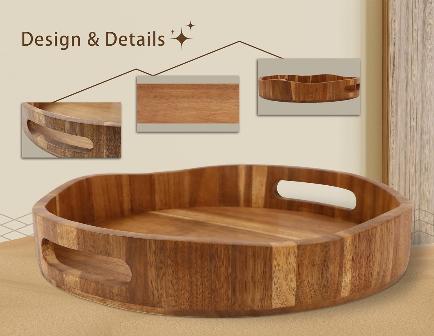 Acacia Wood Serving Tray with Handles, Round-12.6inch Perfect for Breakfast, Lunch, Dinner, Food Snacks Drinks for Coffee Table,Decorative Ottoman Tray for Living Room Kitchen, Bedroom