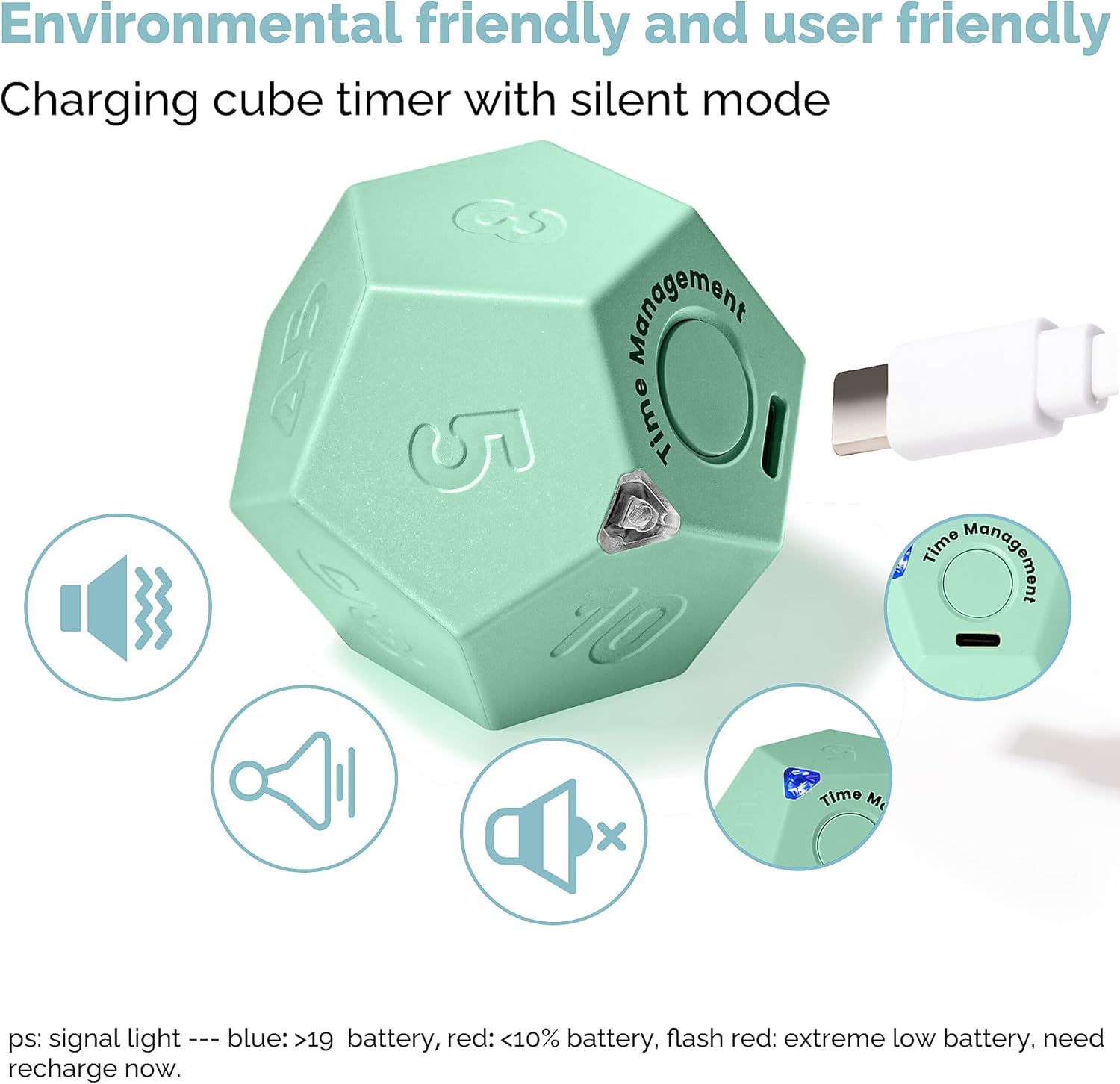 KADAMS Pomodoro Cube Timer Productivity-11 Preset Countdowns, Flip-to-Start Gravity Activation - Sound Vibrate Mute Rechargeable - Ideal for ADHD Kid Kitchen Classroom Cook Study Exercise - Green