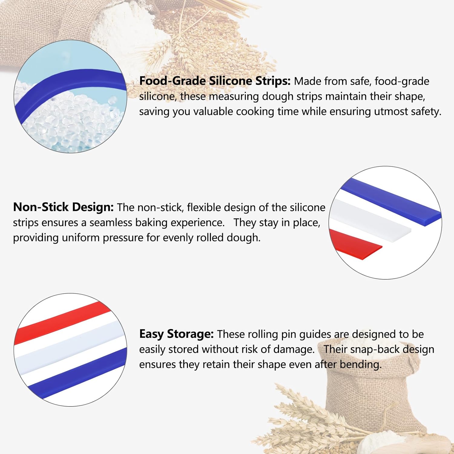 - Food Grade Silicone Strips: Made from high-quality food grade silicone material, these measuring dough strips are safe to use and provide a smooth rolling experience with their comfortable touch and smooth surface.