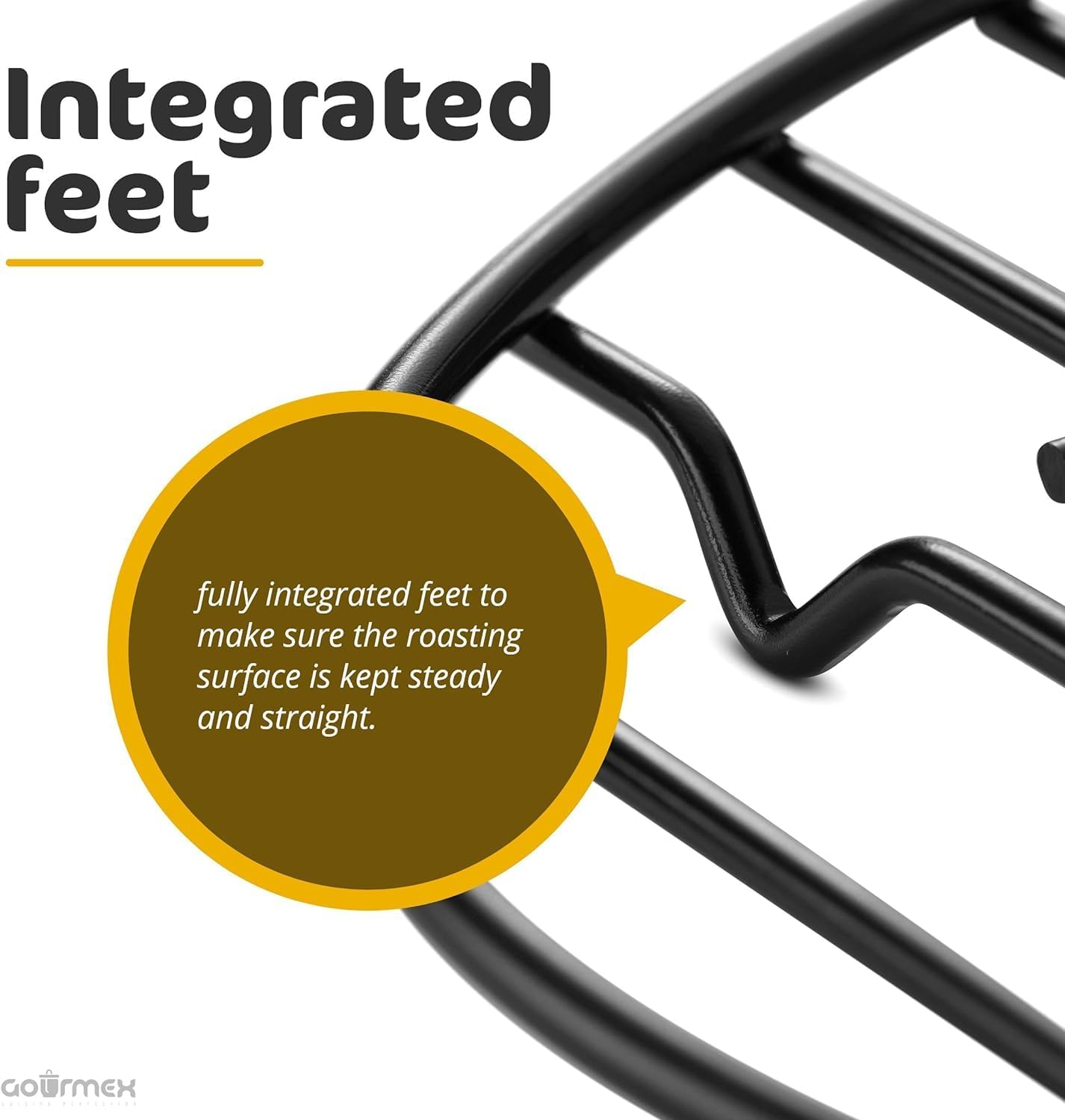 - OVAL BAKING RACKS FOR OVEN USE- These flat roasting racks were designed to roast chicken, fish, or beef in a pan or pot without getting the food stuck on the roaster or baking sheet. Made to raise the food you are cooking, out of the fats and liquids, allowing the foods to be truly roasted instead of stewed. The feet are fully integrated to make sure the roasting surface is kept steady.