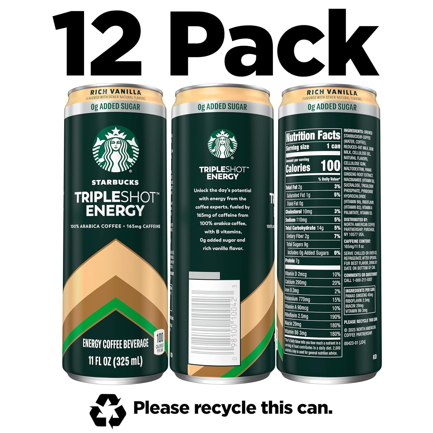 - Includes 12 (11 fl oz) cans of Starbucks Tripleshot Coffee Energy Drink, Iced Coffee, Rich Vanilla, Triple Blend of 165mg caffeine, B vitamins, and protein, (Packaging and Formula may vary)