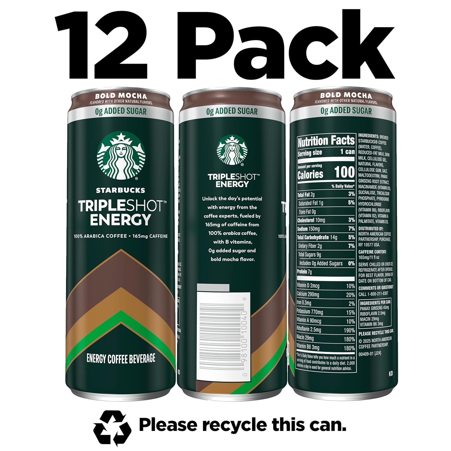 - Includes 12 (11 fl oz) cans of Starbucks Tripleshot Coffee Energy Drink, Iced Coffee, Bold Mocha, Triple Blend of 165mg caffeine, B vitamins, and protein, (Packaging and Formula may vary)