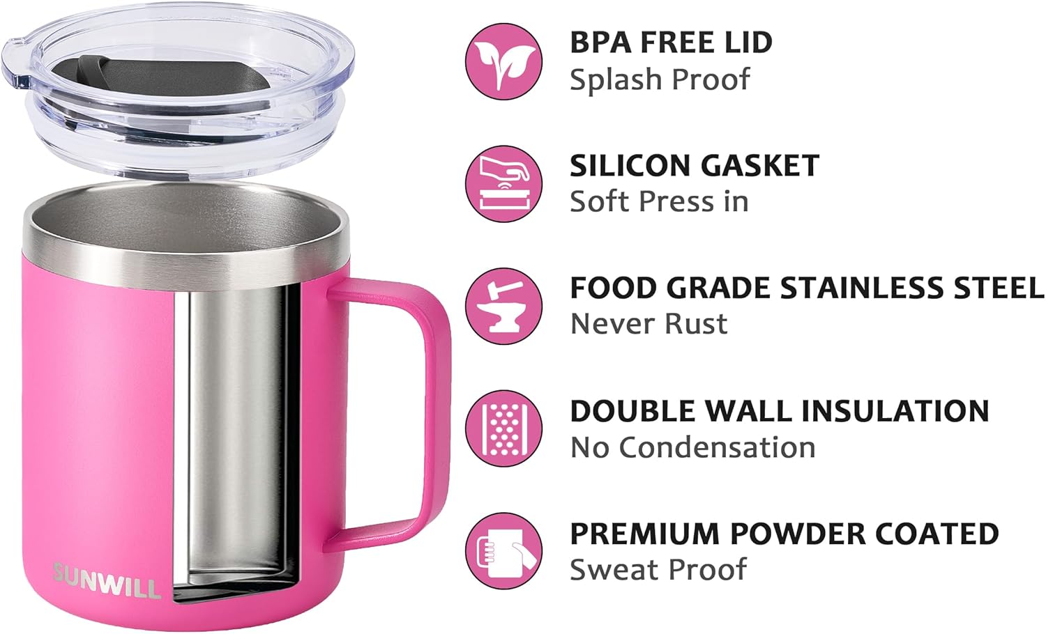 - Insulated Coffee Mug 14 oz: Double-wall vacuum insulation technology, keep beverages hot for 3+ hours and cold for 9+ hours, sweat proof, no condensation, burn free