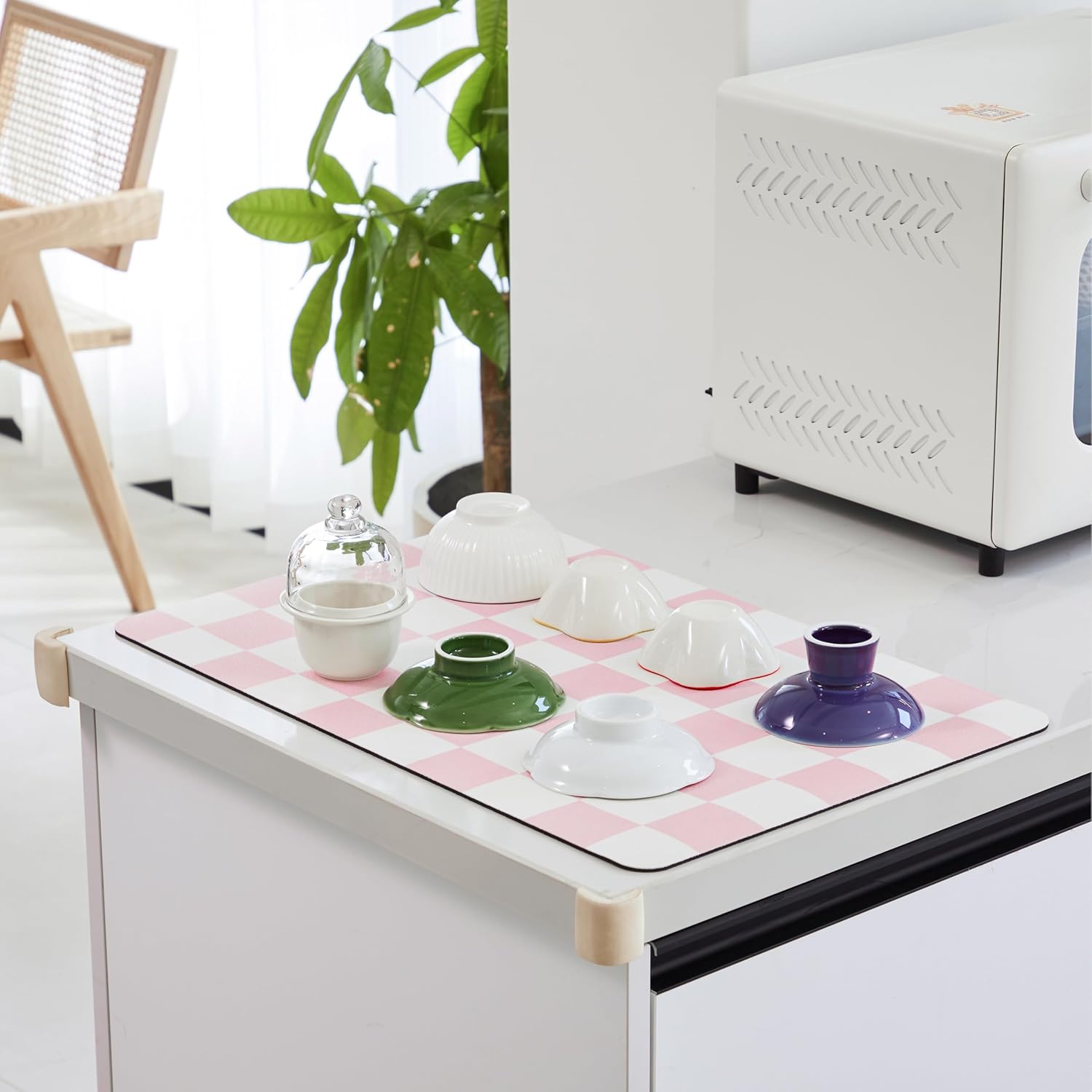Checkered Dish Drying Mat for Kitchen Counter, Coffee Bar Station Accessories, Retro Cute Aesthetic Girly Women Modern Absorbent Drainer Mat Kitchen Drying Mat Easy Clean, Pink 16" x 24"