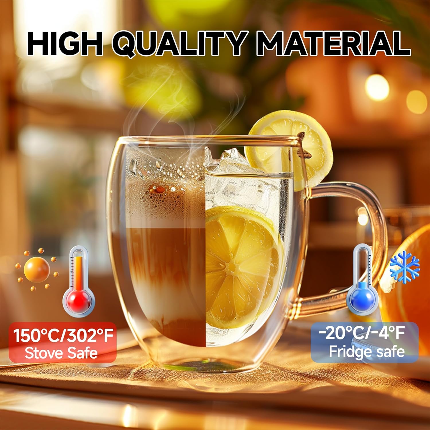 - 【DOUBLE WALL DESIGN】 - The double walled glass coffee mugs design of this utilizes double-layer technology. When the inner layer becomes hot, the outer layer will not heat up, protecting your hand from scalding and maintain the temperature of the beverage.