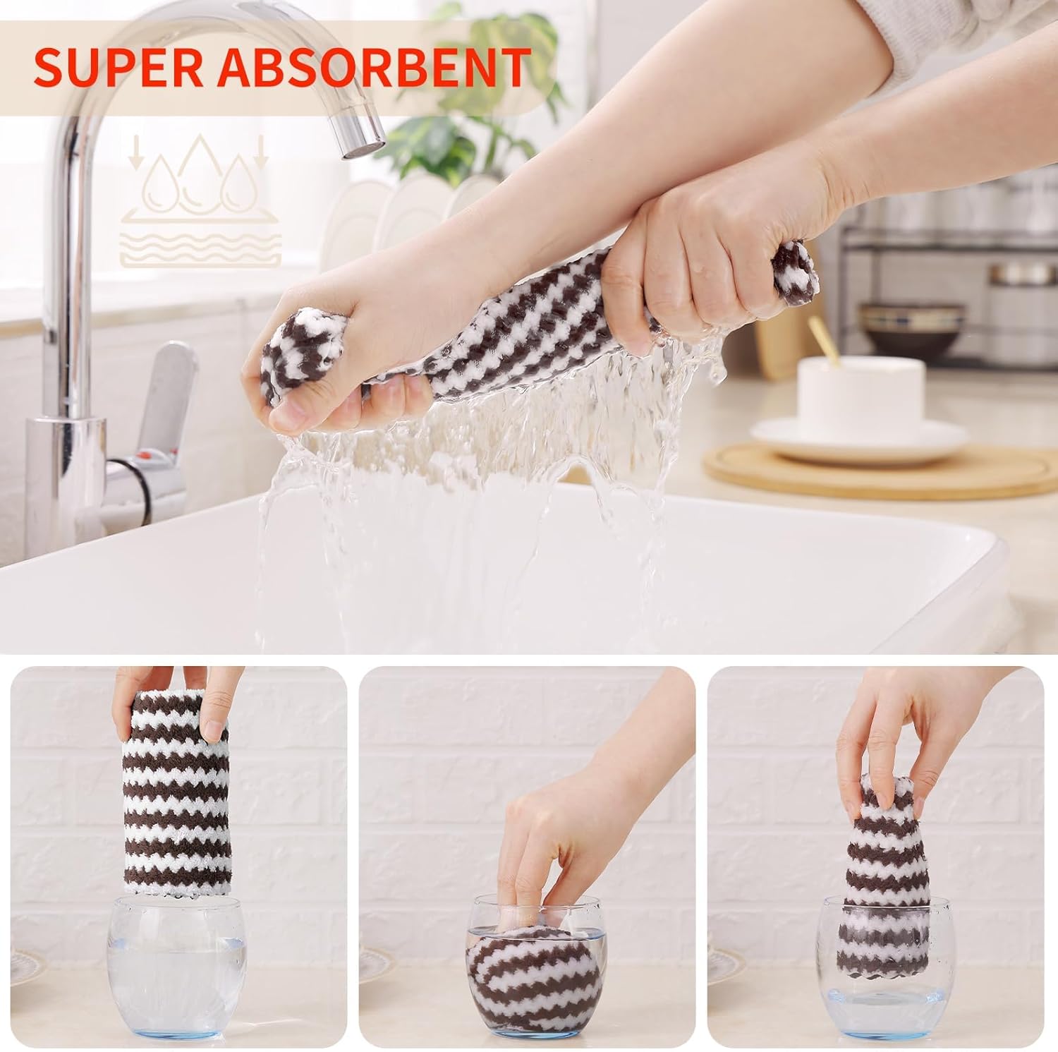 Homaxy 24 Pack Kitchen Dish Cloths, Ultra Soft and Absorbent Dish Towels, Reusable Fast Drying Microfiber Cleaning Cloth, Coral Velvet Wave Design No-lint, 10 x 10 inches, Brown