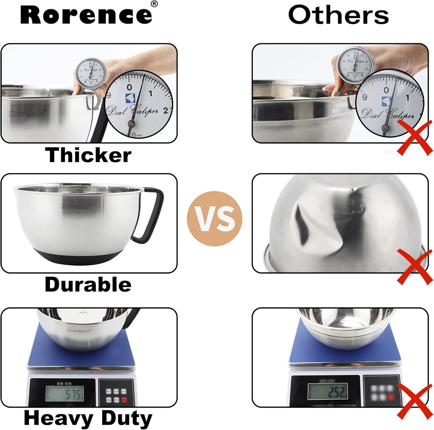 - 【Premium Food Grade Stainless Steel】 Rorence Salad Bowls are made from high quality stainless steel which won't rust, crack or chip. They are more durable and nicer to use than plastic bowls. The Metal bowls are lightweight than glass and ceramic bowls, which makes them easy to handle, even ideal for the young bakers