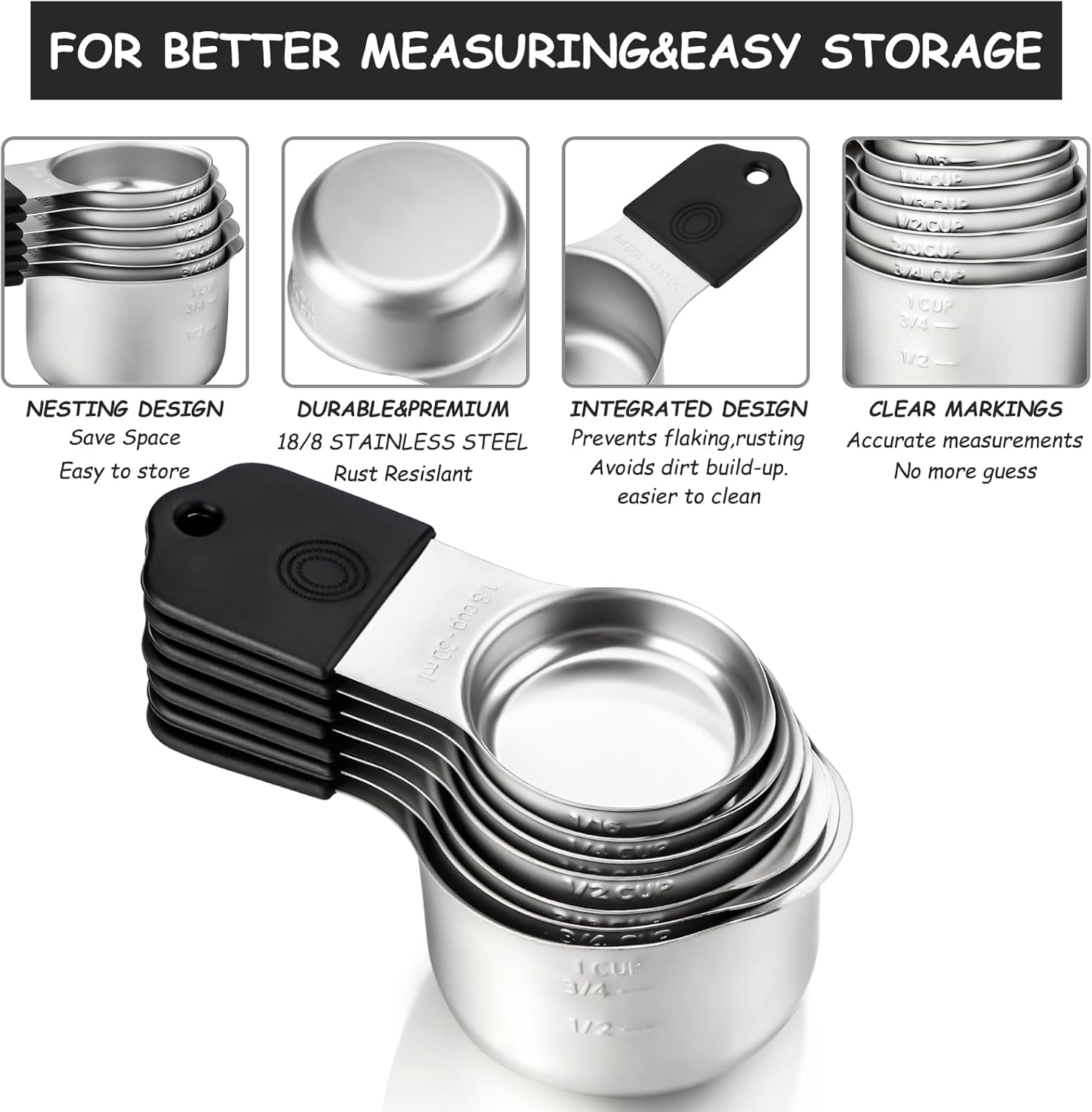 - 【 Magnetic Measuring Cups 】magnetic measuring cups and spoons set. Engineered with powerful magnets, these tools neatly stack together, easily attaching to any metal surface for quick access and space-saving storage.The smooth bottom ring can be stored flat, and the silicone handle of the measuring cup has holes for easy hanging.