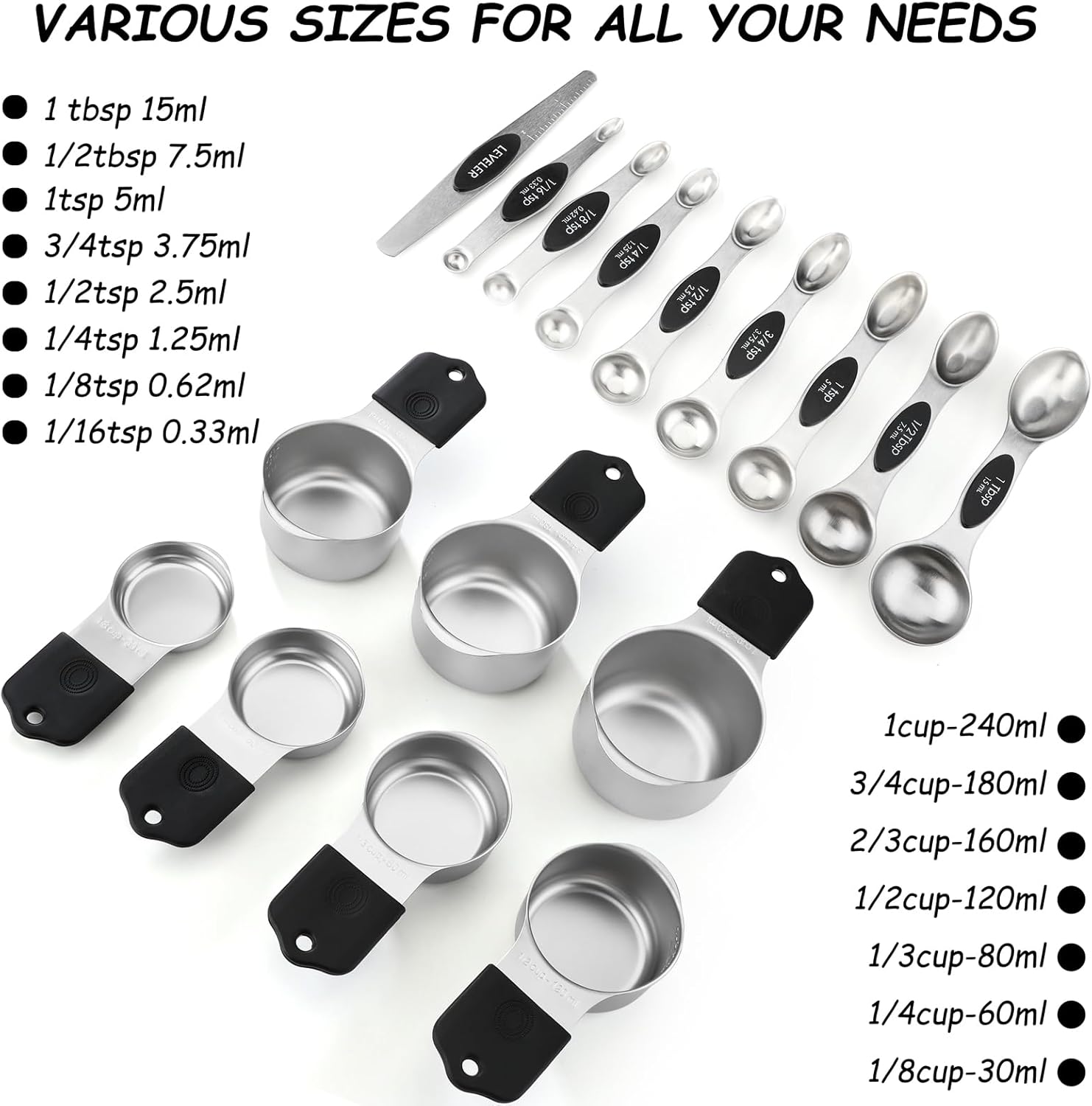 - 【Magnetic Measuring Cups and Spoons Set】This stainless steel heavy duty magnetic measuring cups and spoons set includes 7 magnetic measuring Cups set (1/8 cup, 1/4 cup, 1/3 cup, 1/2 cup, 2/3 cup, 3/4 cup, 1 cup), 8 magnetic measuring Spoons set (1/16 tsp,1/8 tsp, 1/4 tsp, 1/2 tsp, 3/4 tsp, 1 tsp, 2 tsp, 1 tbsp), 1 Leveler, various sizes meet all your baking needs.