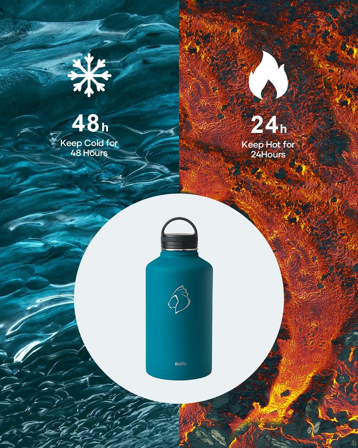 - There is Always One for you: BUZIO insulated water bottle meets your imagination in all aspects of drinking, from the comprehensive sizes (32oz-64oz) to classical and stylish designs, from the production materials to convenient accessories. Come to BUZIO, there is always one for you.