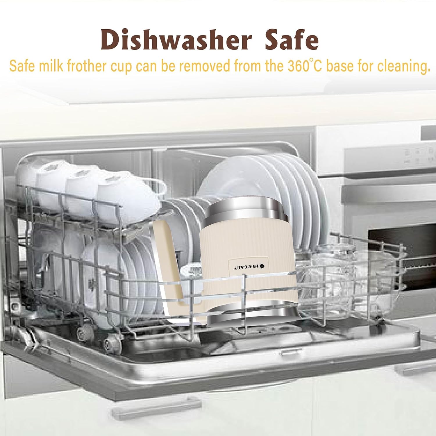 - ☕【Detachable Design & Dishwasher Safe 】-- It can free your hands. The base and body of the automatic milk frother are detachable, which is very convenient to removed from the base for cleaning, also the stainless steel milk jug is dishwasher safe,The removable milk jug features a convenient spout for easy pouring without splashing.