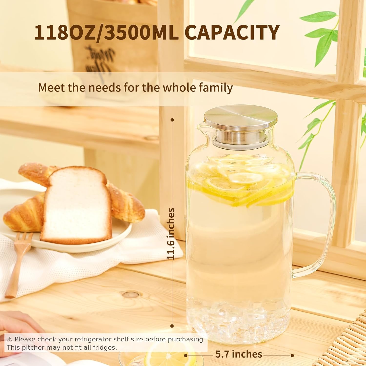 Glass Pitcher, 3.5L/118 oz Glass Water Pitcher with Lid and Spout, Heat/Cold Resistant Borosilicate Glass Water Carafe for Coffee, Juice and Homemade Beverage