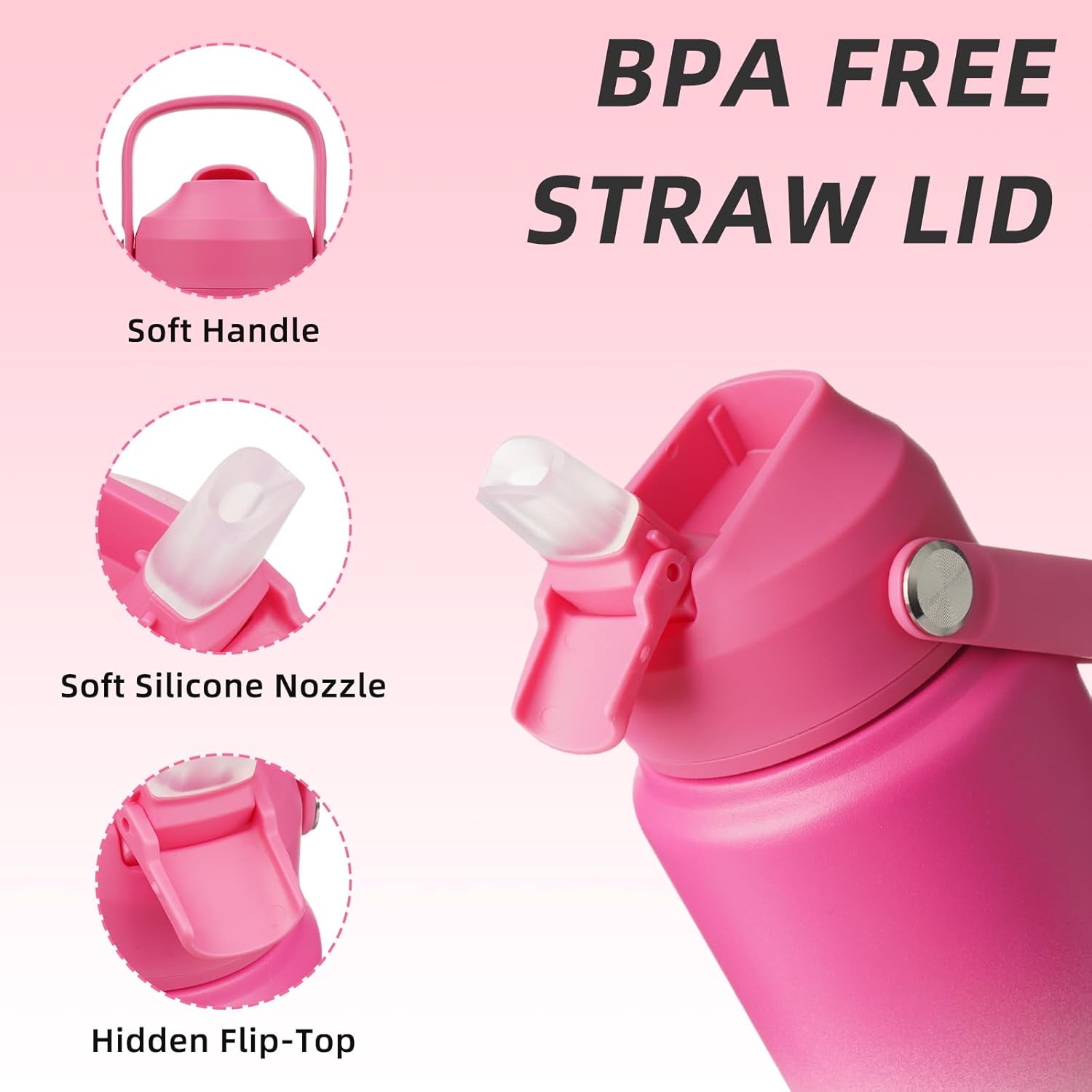 - INSULATED WATER BOTTLE WITH UPGRADED STRAW LID: BJPKPK insulated water bottle with straw lid use hidden flip-top Straw Lid to ensure open and close easily with one hand. The handle is soft and can freely rotate 180° for effortless carrying. Soft silicone nozzle will give you a better drinking experience. Upgraded hidden nozzle design can also keep the nozzle clean and ensure leakproof when it closed