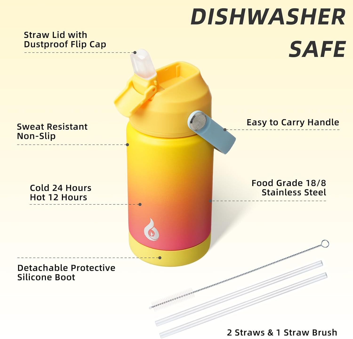 - NON-SLIP PROTECTIVE BOOT & DISHWASHER SAFE: This stainless steel water bottle comes with a detachable silicone boot to protect the bottom from bump damage. The wide mouth design of our water cup allows for easy filling, pouring, and cleaning. With 2 straws and 1 straw brush, you can easily clean the nozzle and straw with straw brush. It is also dishwasher safe, saving you time and effort in maintaining its cleanliness and hygiene
