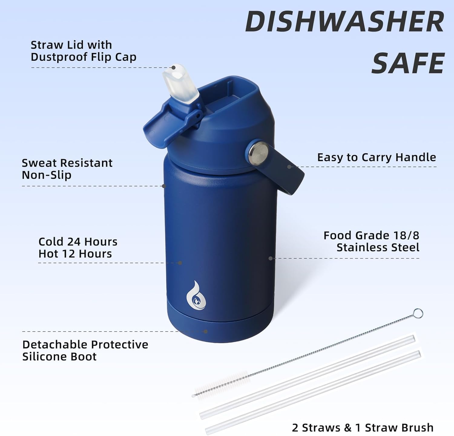 BJPKPK Insulated Water Bottle with Straw Lid, 12oz Thermos Water Bottles, Flex Handle & Non-slip Boot, BPA Free Leak Proof Stainless Steel Metal Thermos, Tumblers, Cups,Klein Blue