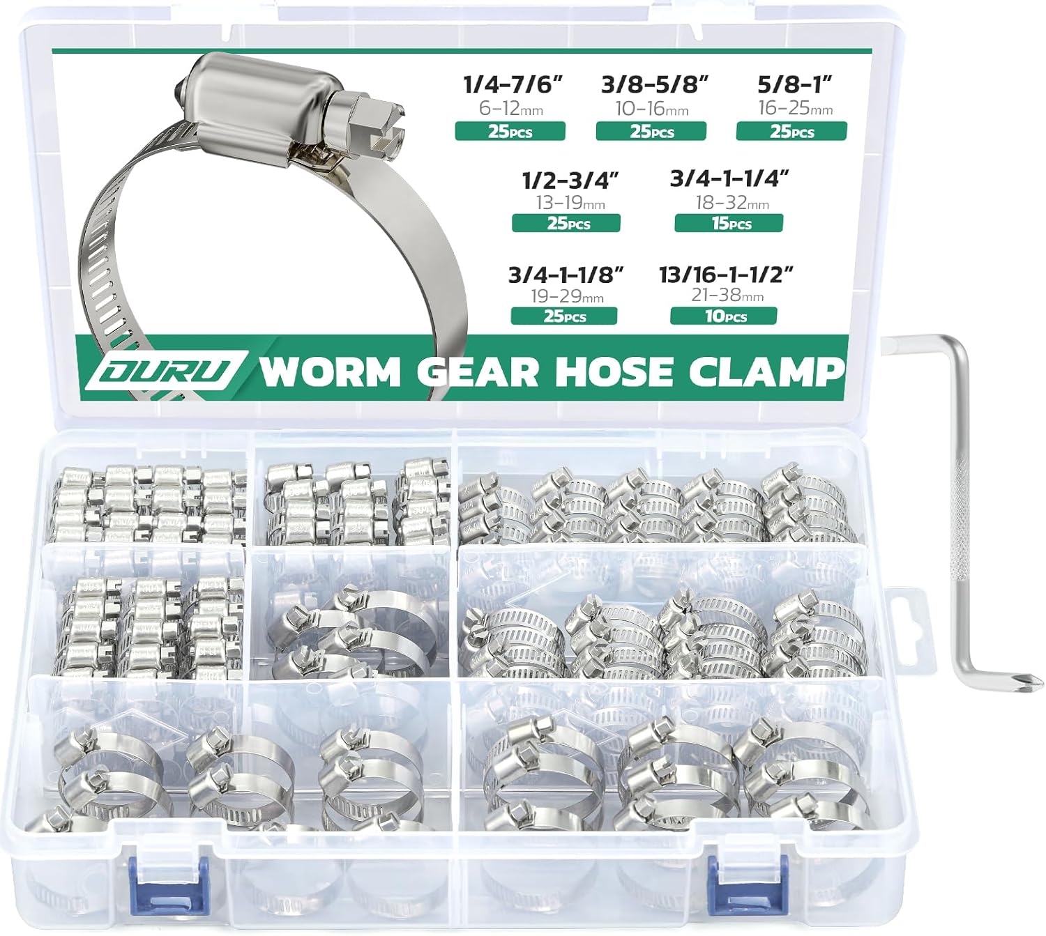 - Easy to Organized —The 150pcs metal hose clamp assortment kit stored in a storage box,easy to store and carry.Each box comes with a small screwdriver for easy size adjustment.Each hose clamp is marked with size information to make it easier for you to identify the correct size of the clamps for each application