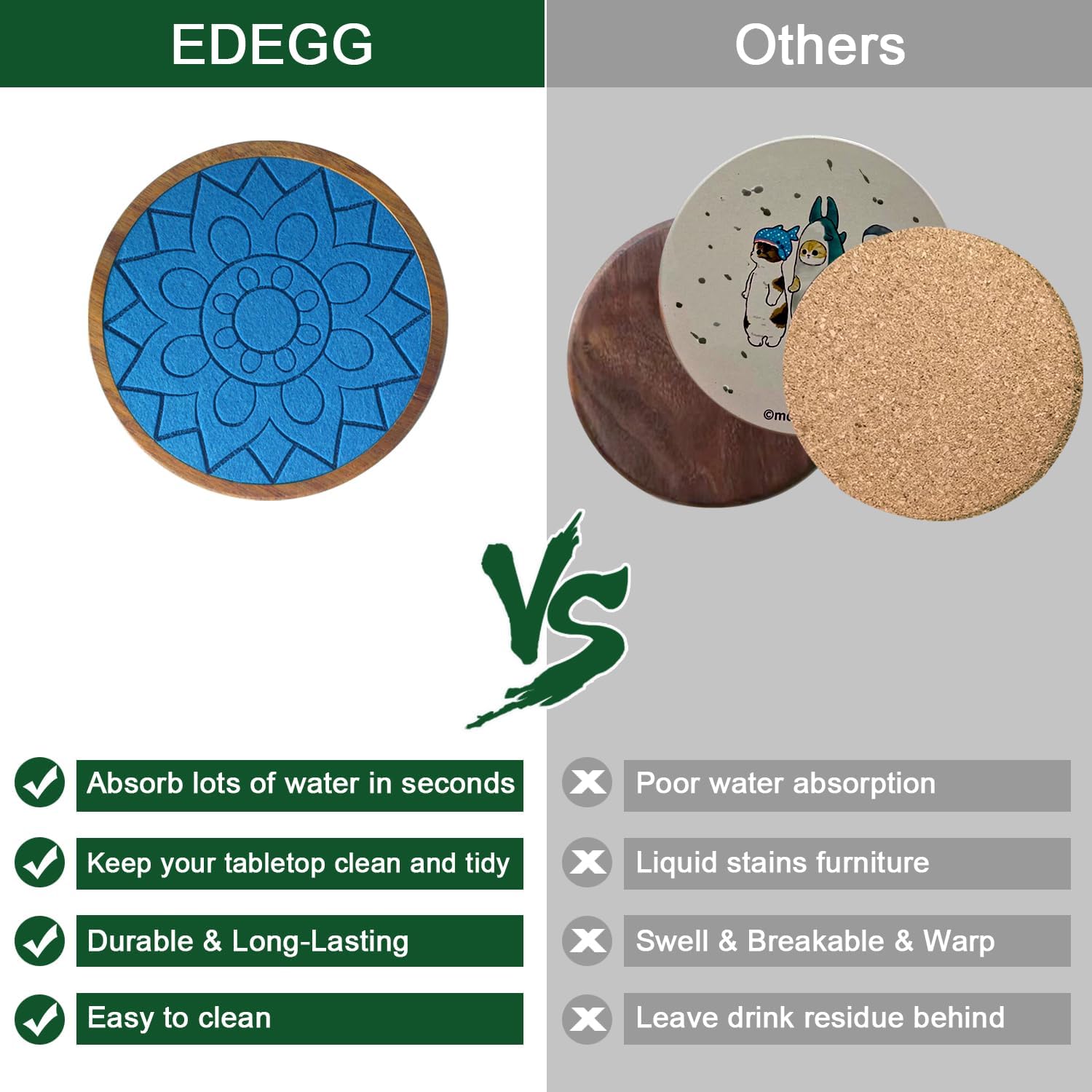 - 🍻Absorbent Coasters with Holder: Wood coasters with built-in thickened felt pads for stronger water absorption and heat insulation, capture liquids quickly and prevent any spills, keeping your tabletop clean and tidy, with no stains and water rings; extra large size easily accommodates cups of all sizes.