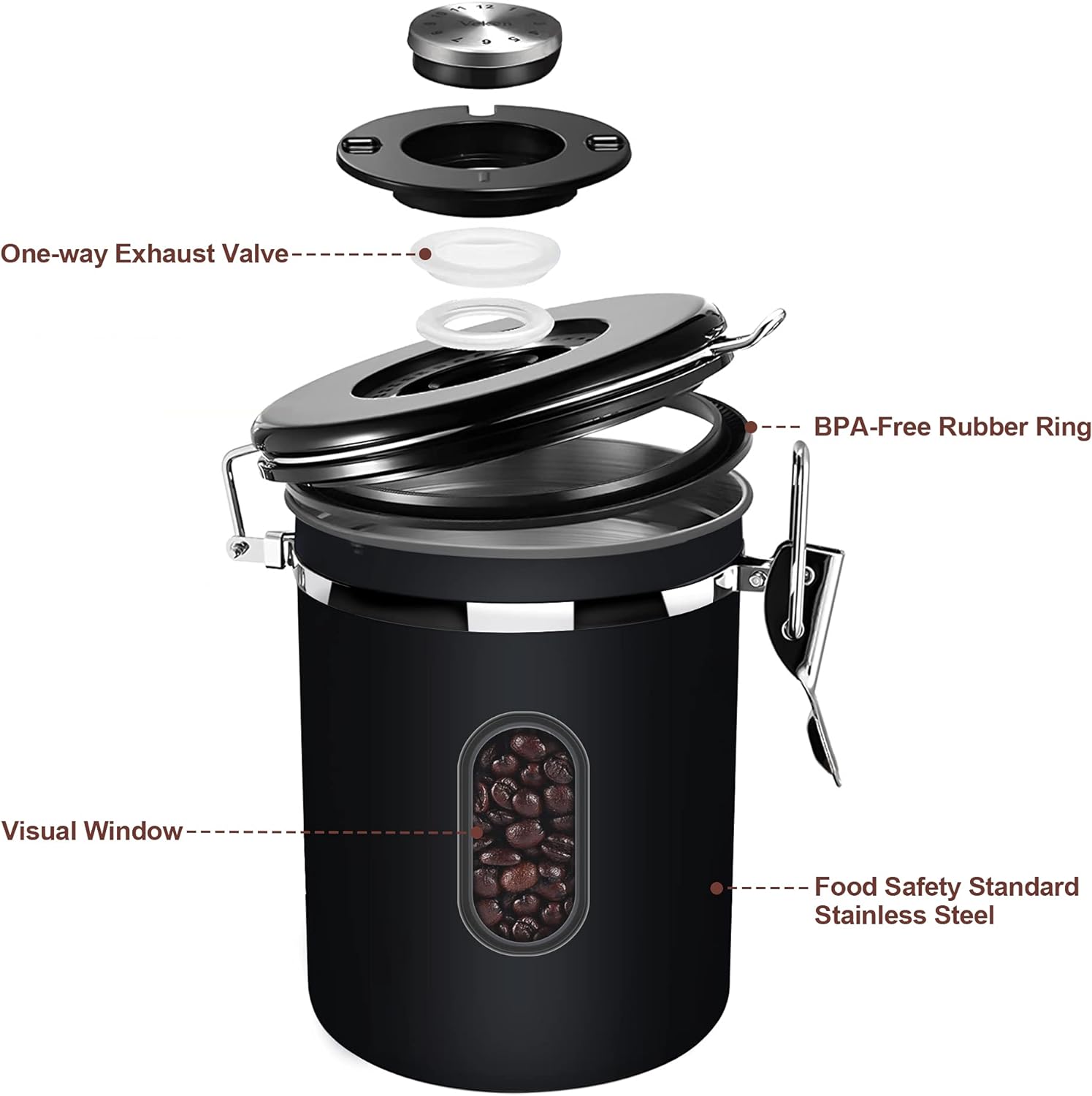 1500ML Airtight Coffee Canister with Date Tracker&Transparent Window, 18OZ Coffe Beans Storage with 30ML Measure Spoon&4 co2 Valve, Coffee Container for Grounds Coffee, Beans, Tea, Sugar, Flour(Black)
