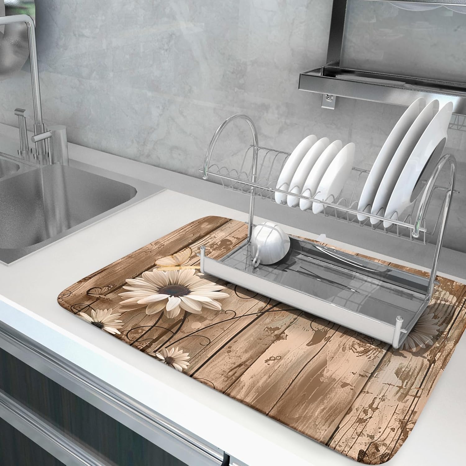 - 【Dish drying mat】The rustic daisy drying pad is 16x18inch/18x24inch, which is suitable for most homes and kitchen countertops while providing a smart and sharp look. Our dish drying mat is soft and durable, can be used as a drying mat, put down all sizes of kitchen tableware, also can be used as a protective pad, dish mat, cup mat, heat insulation pad for countertop for heat insulation and ironing, which can perfect hold your dishes, plates, big pots and pans.
