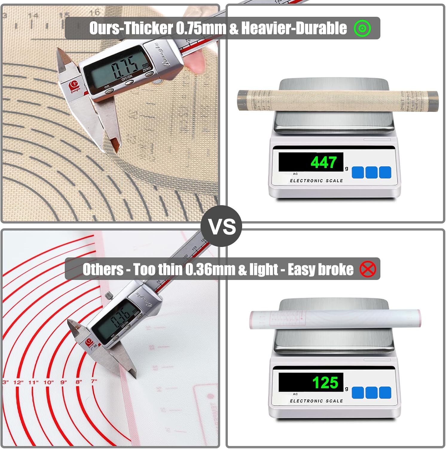 - 【Double Thickness & Extra Large】: Silicone baking mat is twice thickness(0.75mm) than the other dough mat (0.35mm) on the market. Our silicone pad will stay good on the table and not wrinkle when used. Ultra large size pastry mats(36X24 inch), which prevent the flour or fondant will be spilled on the table.