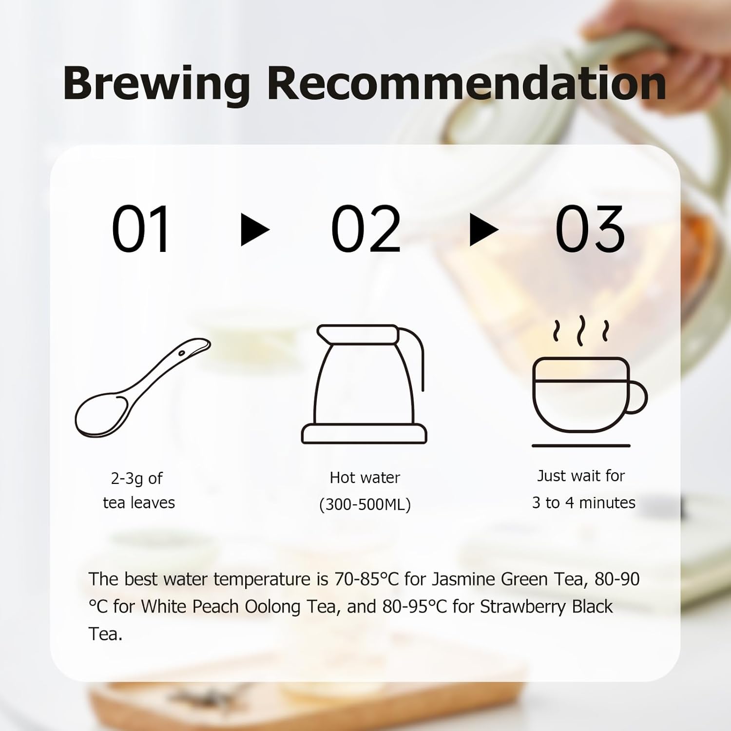 - 【Taste Characteristics and Aroma Quality】:White Peach Oolong Tea has a soft and smooth, slightly sour and sweet taste, and a rich and fresh aroma. Jasmine green tea has a fresh, smooth and soft taste with a light and elegant aroma. Strawberry black tea has a sweet, soft and fruity taste with a fresh and pleasant aroma.