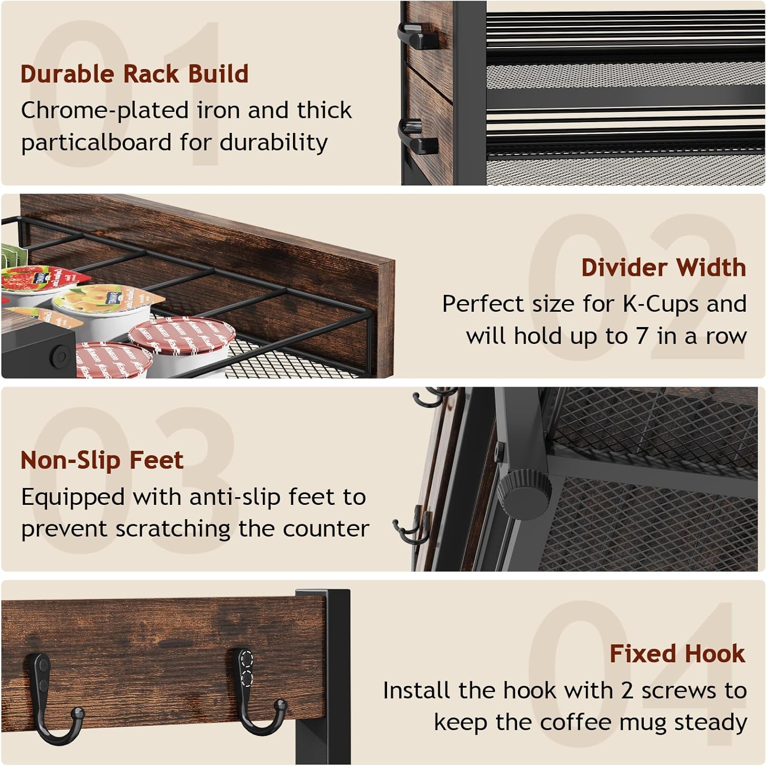 K Cup Holder Drawer - Coffee Pod Organizer for Counter, Sturdy k cups Storage Drawer with Mug Rack, Coffee Maker Stand, 70 Capacity Pods, Home Kitchen Counter Organizer, Rustic Brown