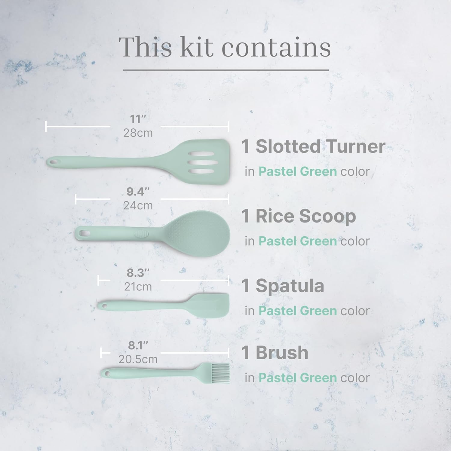 Silicone Utensils 4-Piece Set – Rubber Spatula, Pastry Brush, Slotted Turner, and Rice Paddle – Complete Heat-Resistant Set for Non-Stick Cookware – Kitchen Tools for Cooking and Baking – Pastel Green