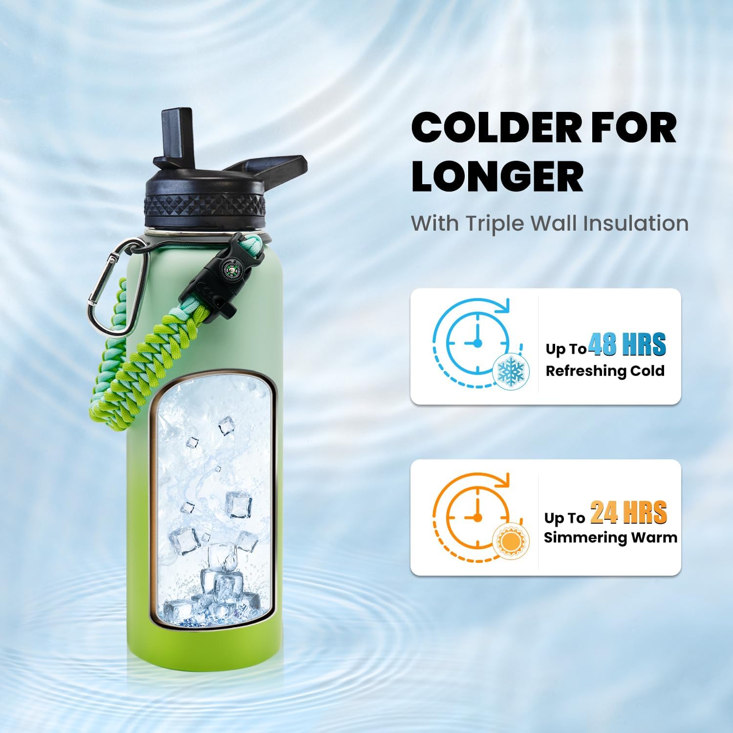 Insulated Water Bottle 40 oz, Triple Wall Vacuum Stainless Steel (Cold for 48 Hrs), Leak Proof & Non-BPA, Modern Water Flask Jug with Paracord Handle & Straw Spout Lids, Ombre Green