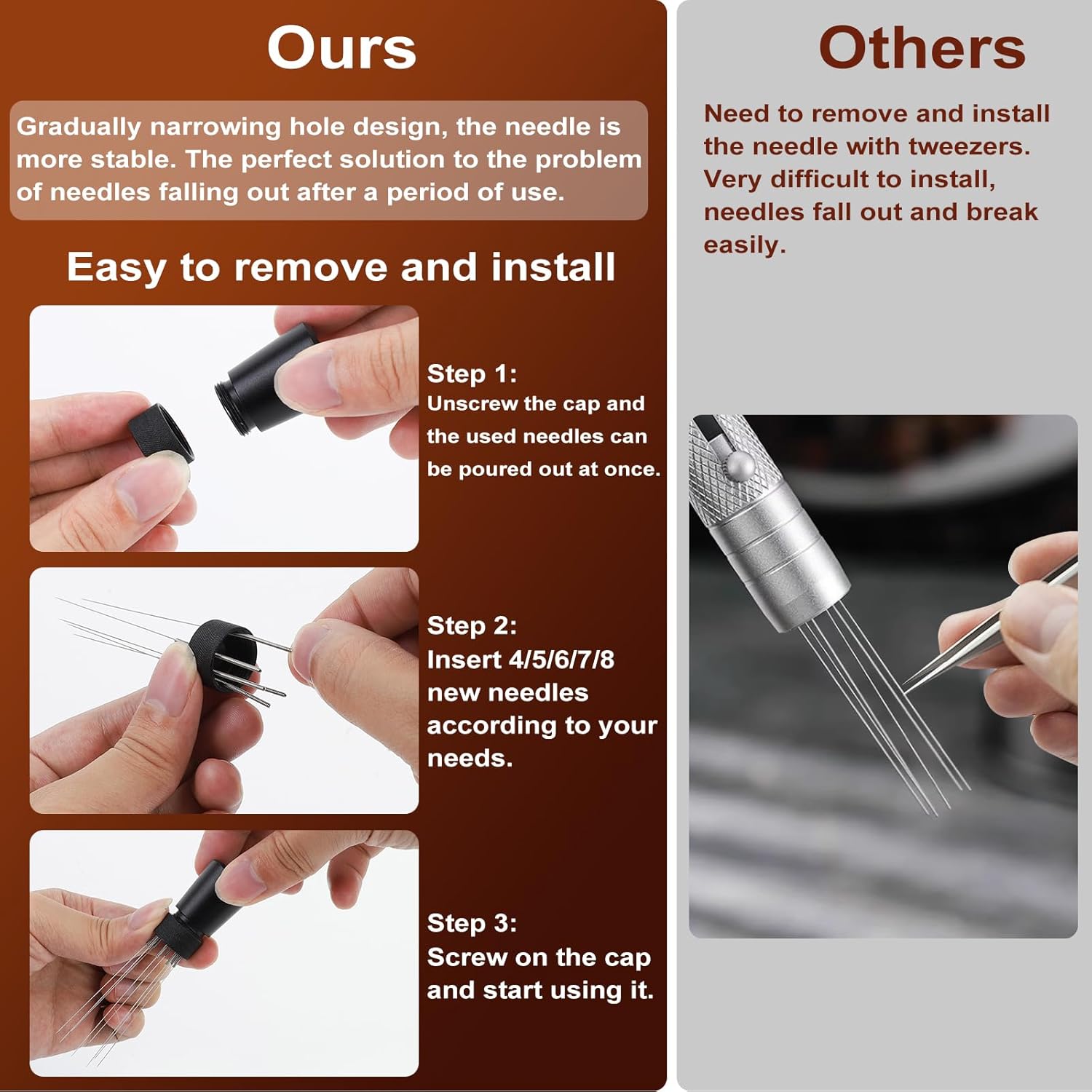 - About Coffee Distribution Stirrer: Espresso WDT Tool-Coffee Distribution Stirrer has up to 8 needles. It is designed to break up clumps,create a uniform coffee bed, and ensure a consistent density in your basket. Only 0.25mm needle promotes better extraction, resulting in a smoother espresso. The agitator is fixed on the design of the iron frame by magnetic suction, which can ensure the perfect preservation and ventilation of the mixing needle, and is not easy to deformation.