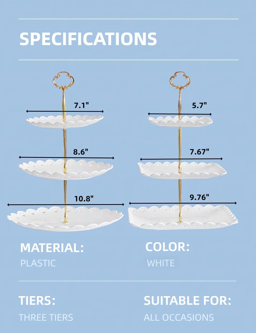 RAUVOLFIA 2 Pack of Plastic Round & Square Dessert Cupcake Stand, 3 Tier Cup Cake Holder Tower for Tea Party/Birthday/Wedding, Plastic Tiered Serving Tray (White)