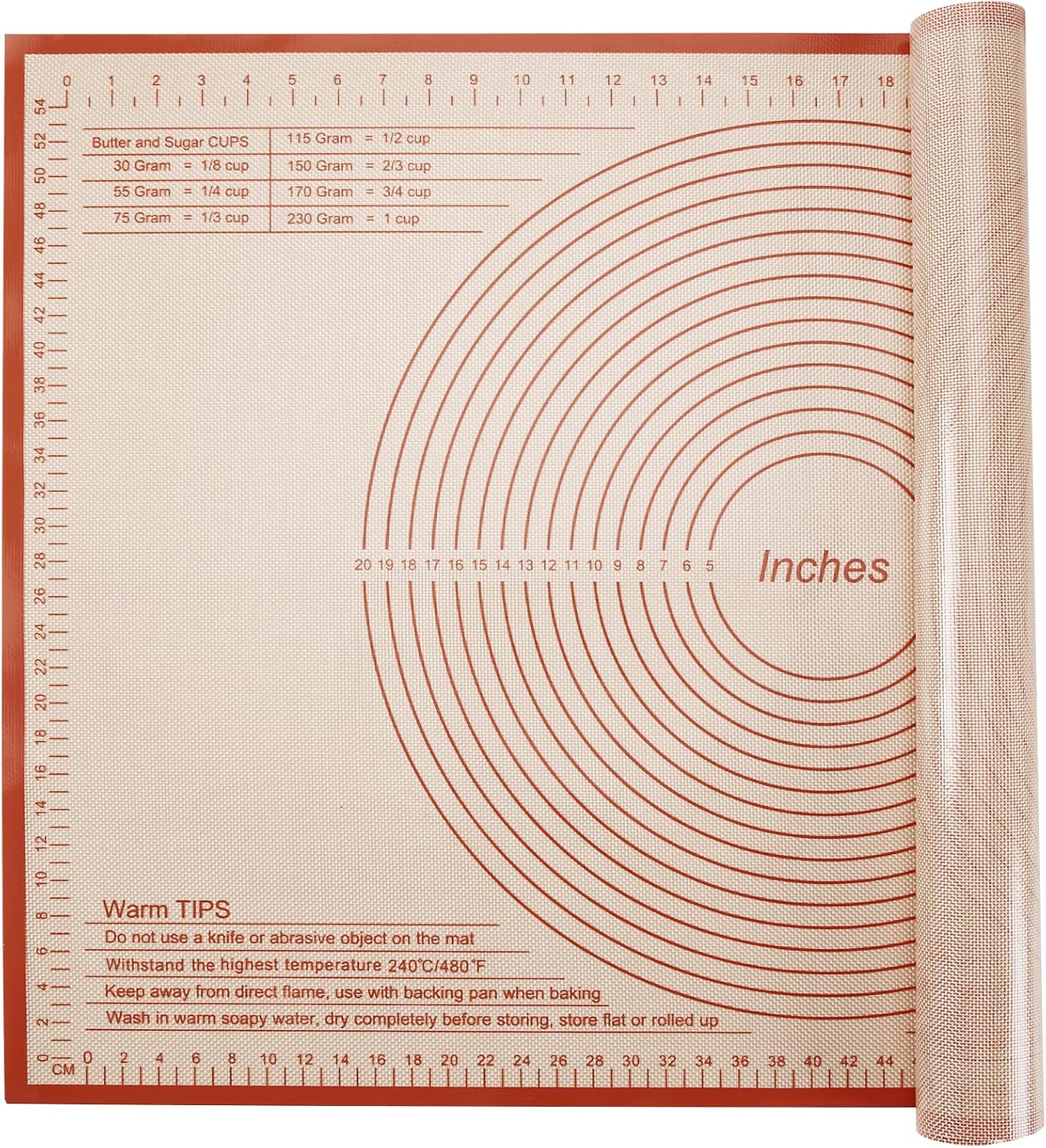 - 【Food Grade Silicone】: This silicone pastry mat is made of reinforced fiberglass and food grade silicone, which doesn’t include the vulcanizing agent. it can be reused over and over, safe, soft, durable and will not wrinkle or fade. This kneading mat is ideal for dough rolls out/kneading, pizza, bread, pasta, cookies, pie crust, biscuit and fondant.