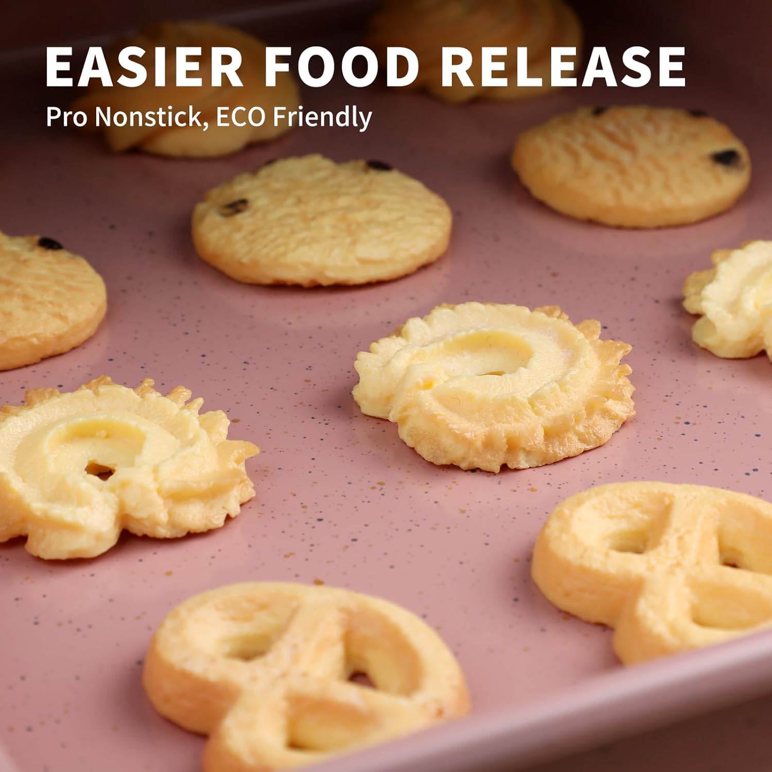 - 🍪Non-stick Baking Sheets for Oven - Including 2pcs quarter baking pans. (SIZE: 11 x 9 x 1 inch) with durable nonstick coating which helps ensure quick effortless food release. Our cookie baking sheets are 0.8MM thicker. The design can help heat distribution quickly and evenl.