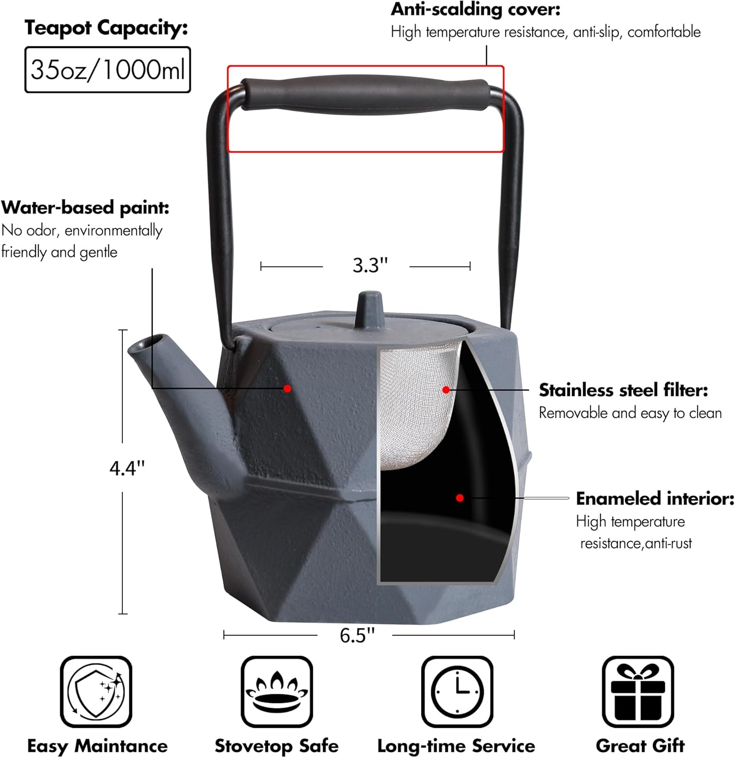Cast Iron Teapot, 35oz Tea Kettle Stovetop Safe with Infuser for Tea Coffee, Japanese Minimalist Diamond Pattern Tea Pot with Enameled Interior, 1000ml Grey
