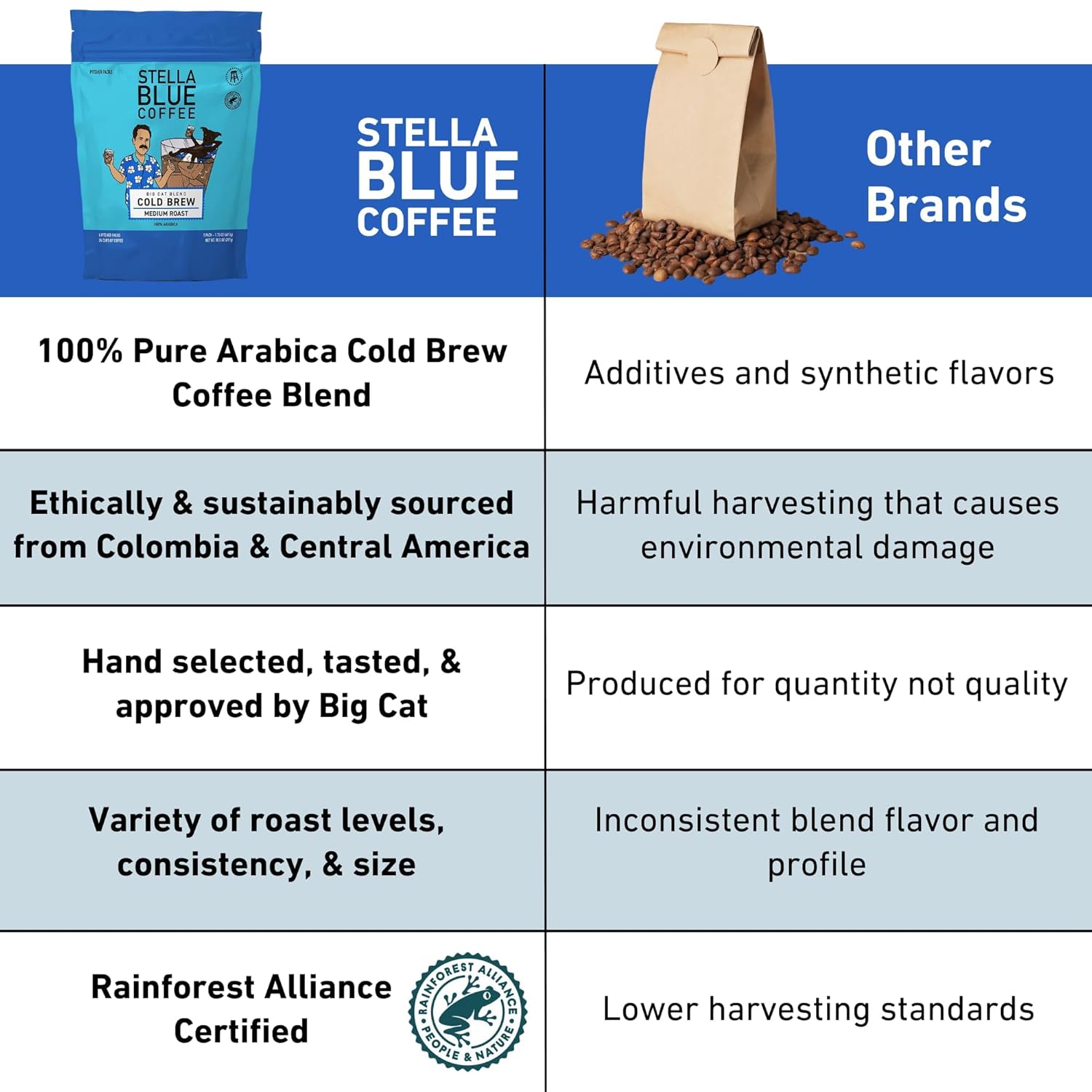 - DISCOVER PREMIUM COLD BREW COFFEE: Savor Stella Blue Big Cat Blend, crafted from 100 percent Arabica beans selected for their smoothness, richness, and low acidity. This cold brew is designed for those who crave full flavor without bitterness, delivering a bold yet balanced taste. Whether poured over ice or paired with cream, it’s the perfect cold brew for mornings, afternoons, or whenever inspiration strikes.