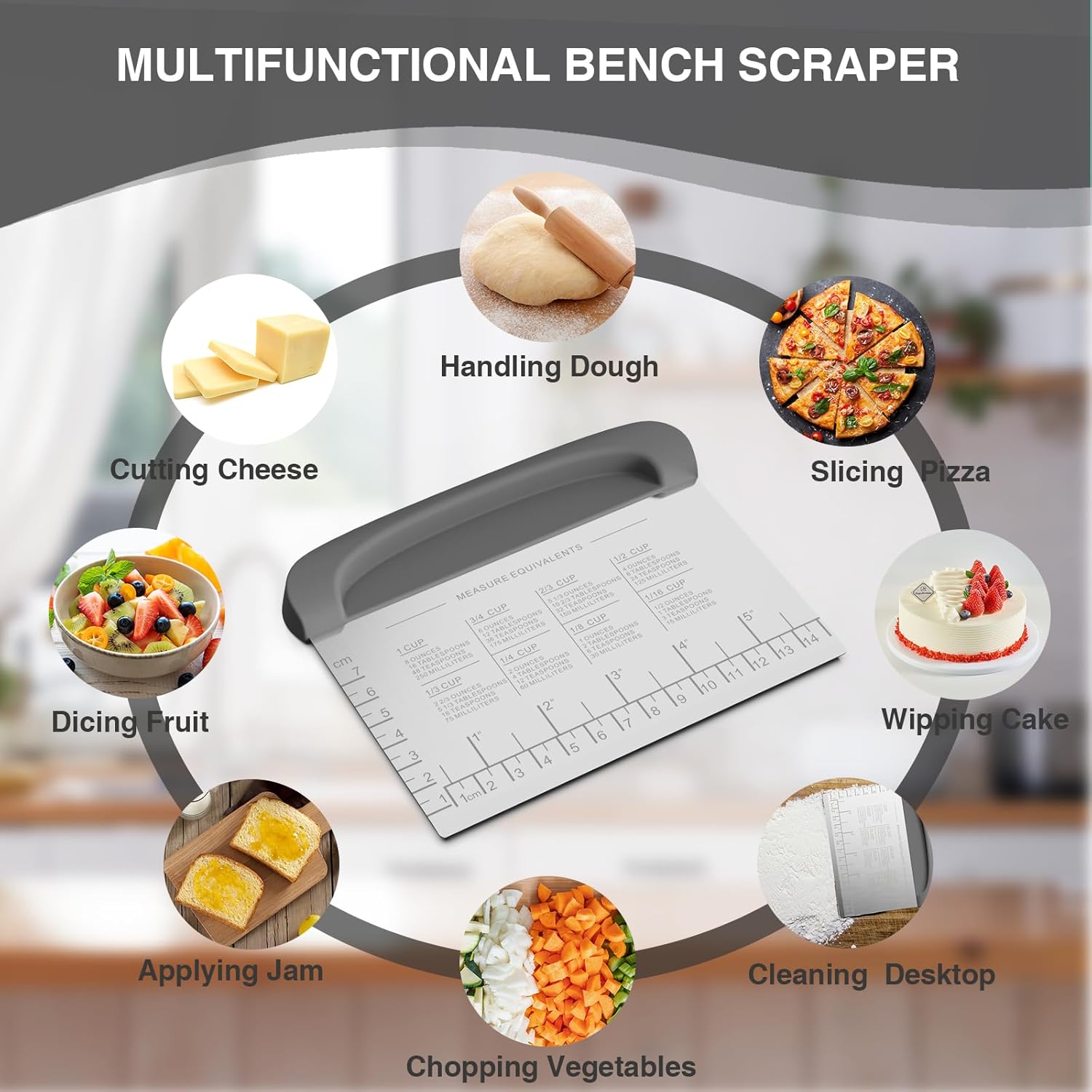 - ✔ [𝗠𝗨𝗟𝗧𝗜-𝗙𝗨𝗡𝗖𝗧𝗜𝗢𝗡𝗔𝗟 𝗕𝗘𝗡𝗖𝗛 𝗦𝗖𝗥𝗔𝗣𝗘𝗥] The pastry scraper is service as a baking tool which is perfect for handling dough: separating, transferring and shaping dough. The sharp stainless steel bread scraper is enough for chopping fruits, nuts, vegetables, slicing bread, pizza, pastry or as a cream, butter coating spatula for cake decoration