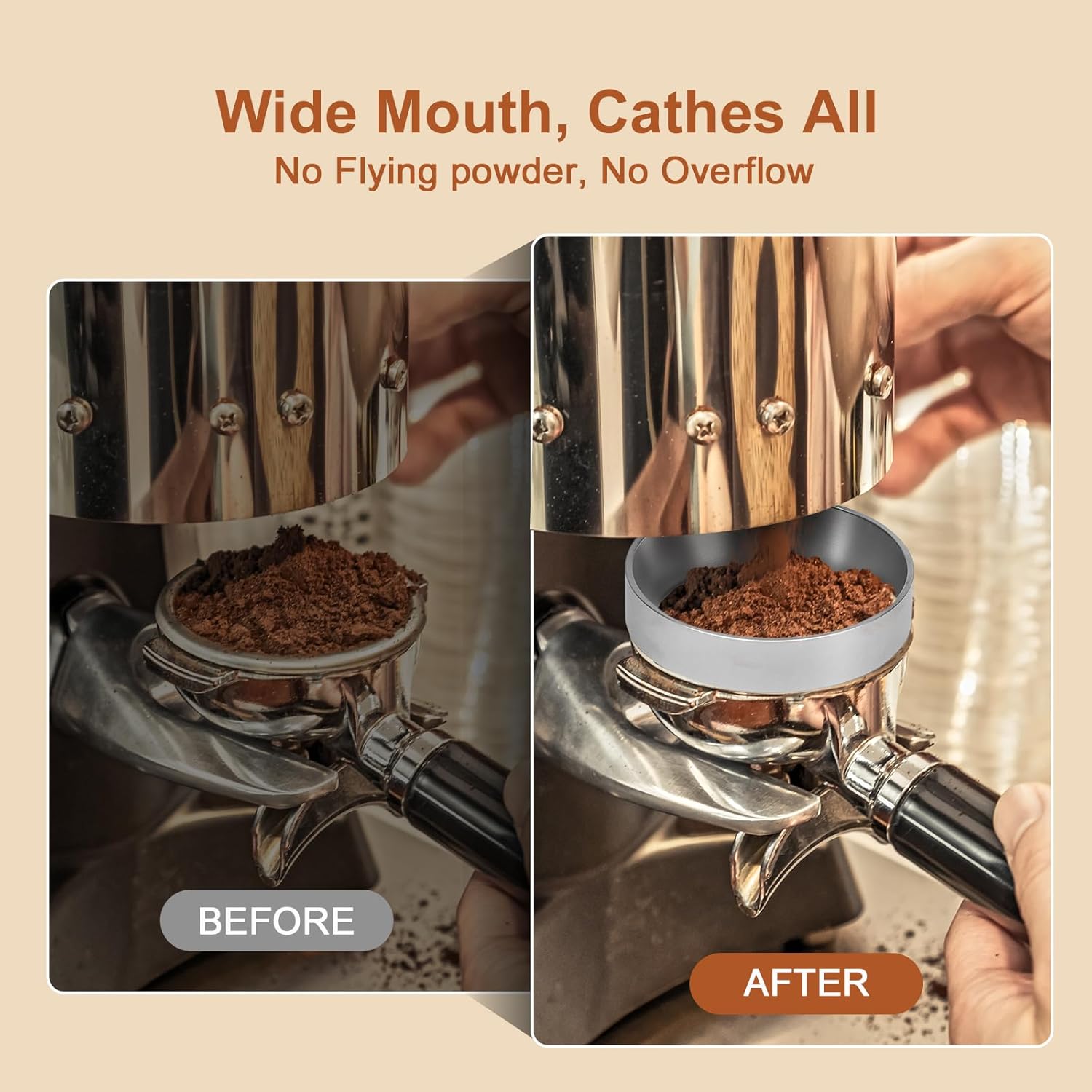 - **Magnetic Design:** Our 49MM coffee dosing funnel features a strong magnetic ring that securely attaches to your portafilter basket, allowing for hands-free operation while distributing coffee grounds evenly and eliminating messy spillage during your espresso preparation process.