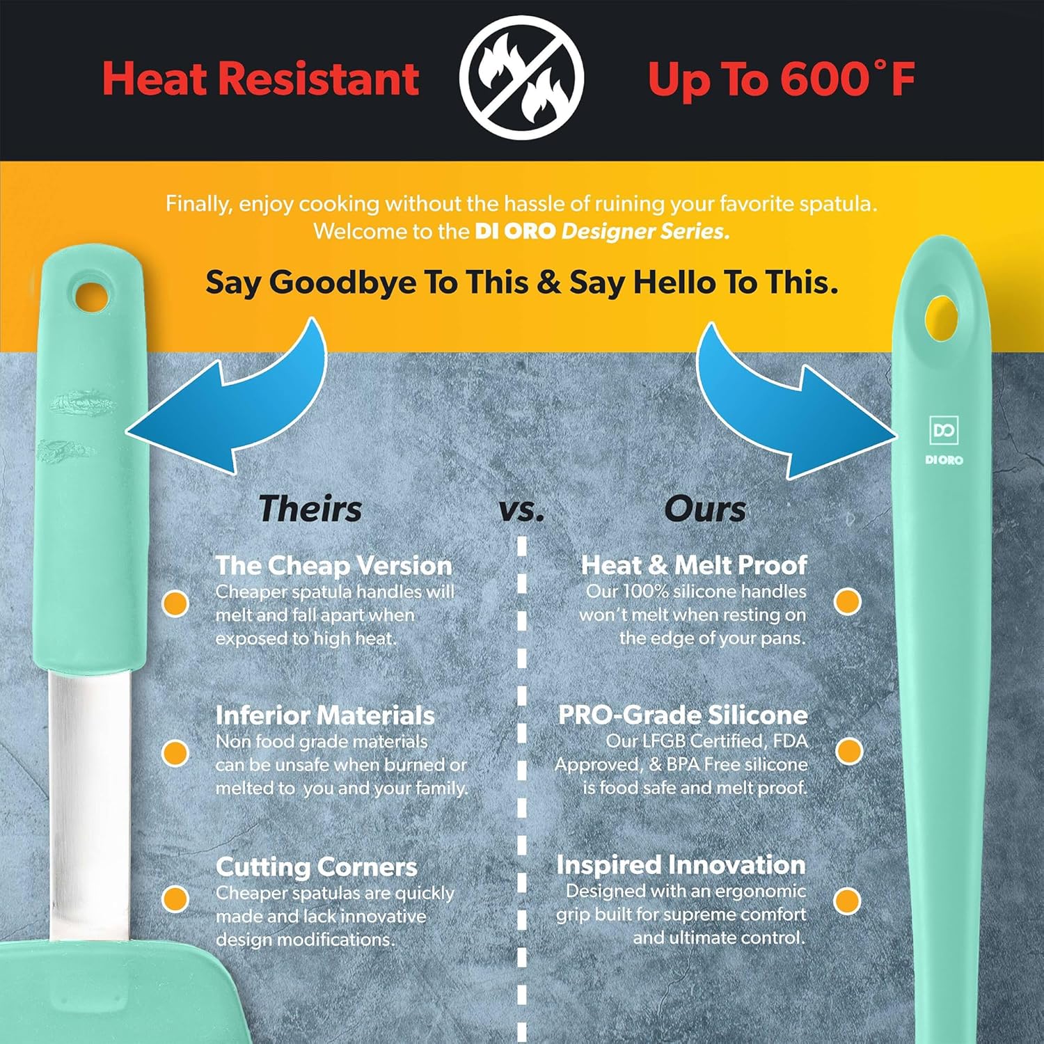 - THOUGHTFUL AND CREATIVE DESIGN – Measuring at a length of 12.5”, constructed with a strong and durable stainless-steel core, and designed with optimum bowl capacity, the DI ORO Silicone Ladle is built to handle stirring, serving, and other tasks in your kitchen with ease. Our 600°F heat-resistant velvety smooth handle will not melt and will fit like a glove in the palm of your hand.