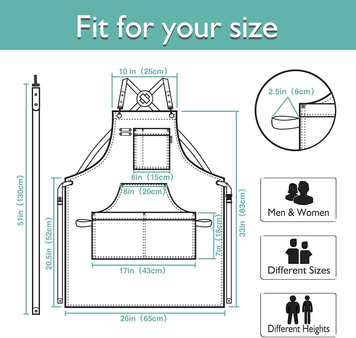 - Universal Size: The apron size is 25.5 inches x 32.5 inches, suitable for full coverage size. The ultra-long, quick-release strap can accommodate multiple sizes, up to men's XXL size (51 inches waist circumference)