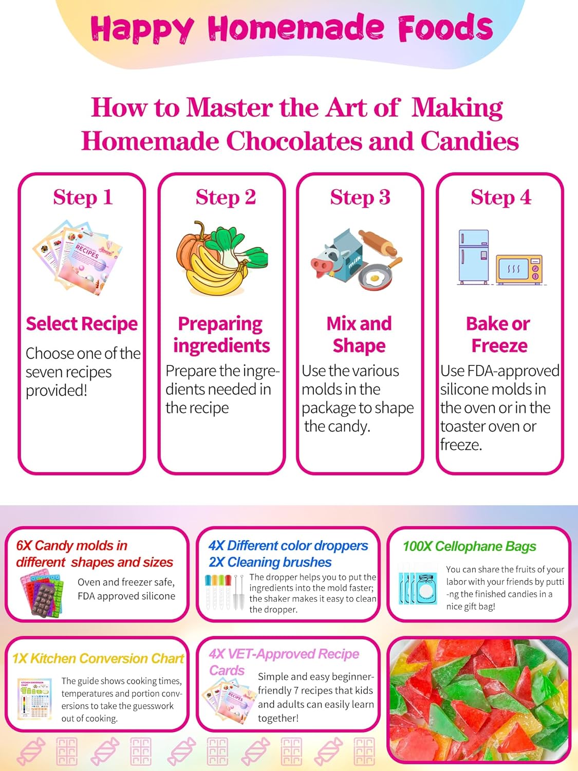 - 📚 "7 Creative Recipe Cards Included – From Gummy Bears to Chocolate Lollipops, Step-by-Step Guides Make Candy-Making Fun and Easy for All Ages!"